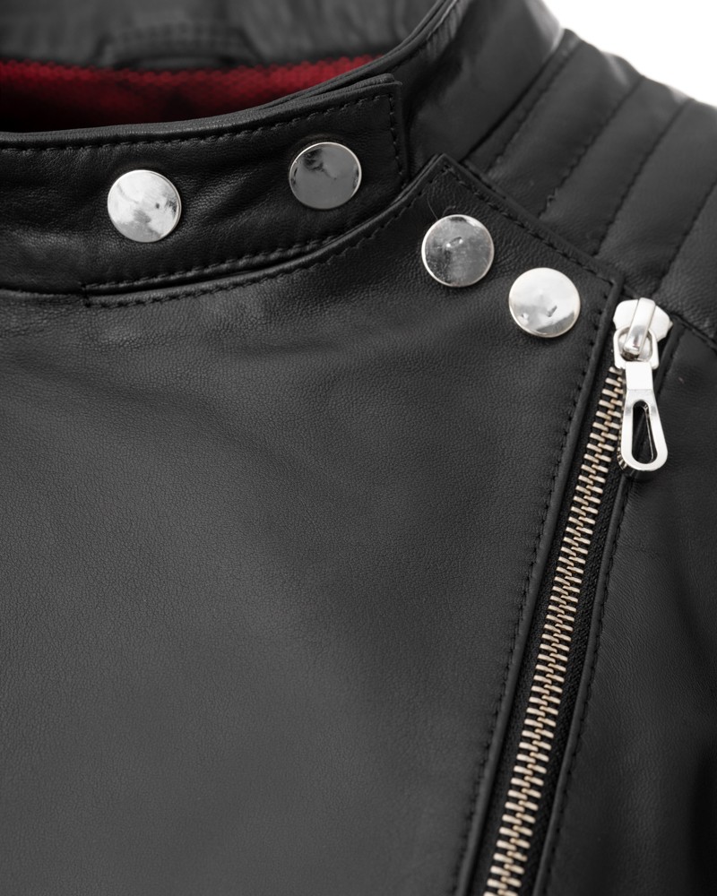 Bikerjacken Damen Anastazja ist ein einzigartiges Projekt, obwohl sie eine typische, bei Frauen beliebte Bikerjacke darstellt. Sie wurde jedoch in jedem Detail perfektioniert und aus hochwertigem, natürlichem, glattem Lammleder gefertigt, das sich durch außergewöhnliche Weichheit und besondere Strapazierfähigkeit auszeichnet, wodurch das Modell der Besitzerin über Jahre hinweg dienen wird, und ihr ermöglicht, über viele Saisons hinweg einzigartige, interessante Outfits zu kreieren. Das Herzstück der Jacke sind ohne Zweifel die , die sowohl beim leicht schräg verlaufenden Hauptverschluss als auch an den Seitentaschen, Ärmeln und Hüften zu finden sind. Besonders letztere verdienen besondere Aufmerksamkeit, da sie – auch auf der Rückseite der Jacke verlaufend – einen einzigartigen visuellen Effekt erzeugen.