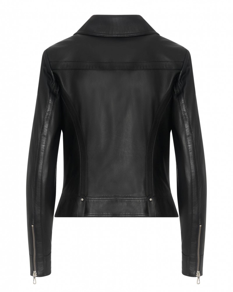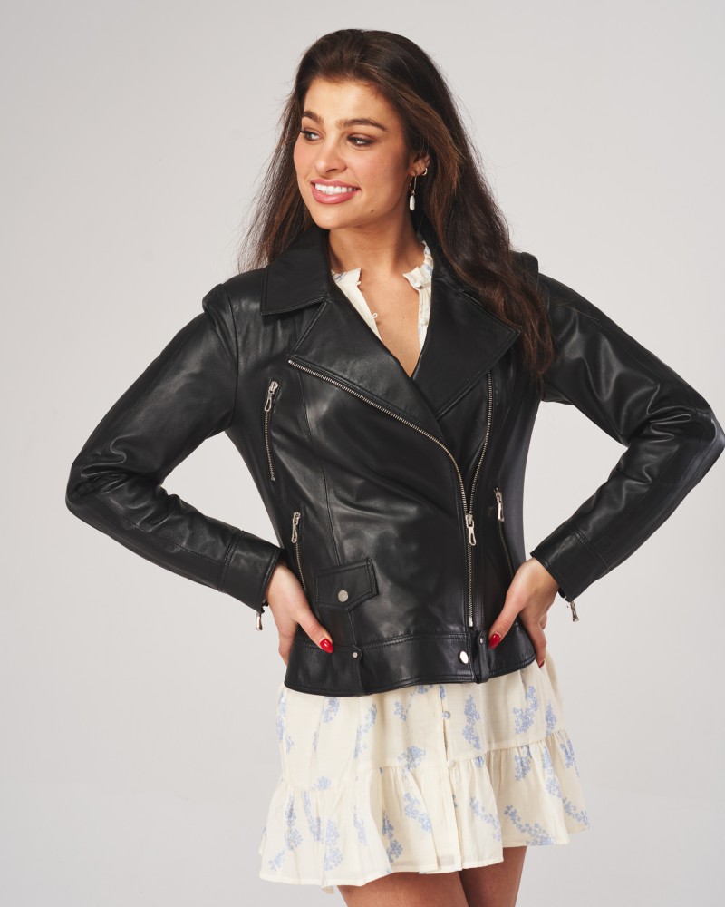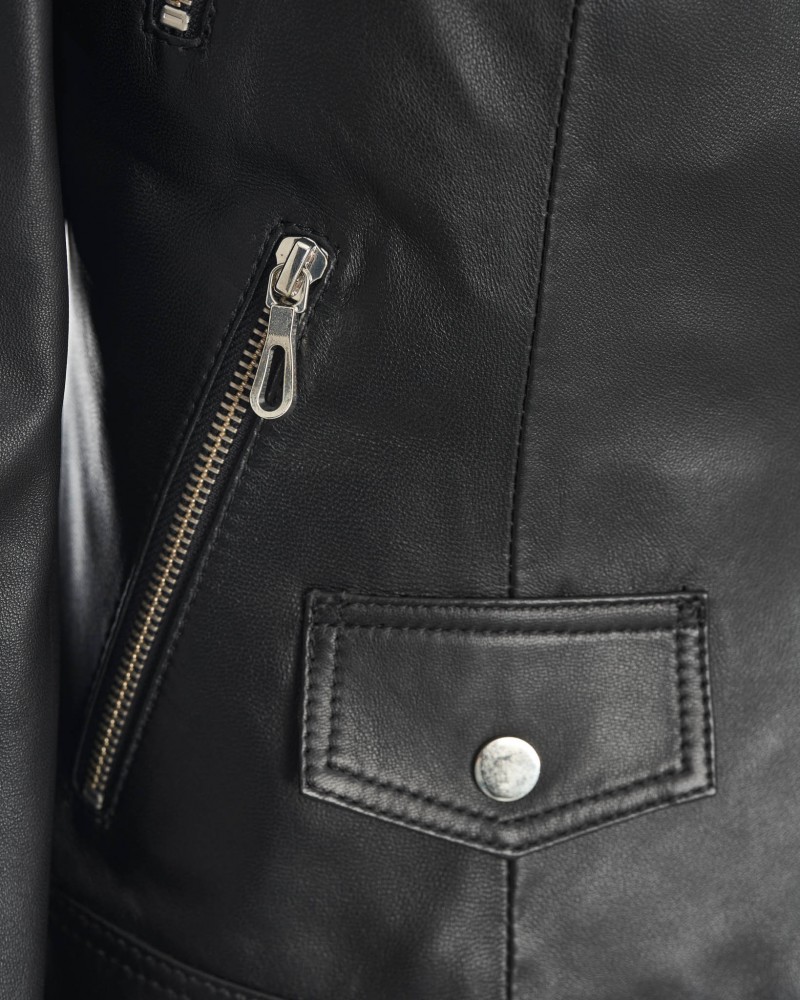 Bikerjacken Damen Ariel birgt viele Geheimnisse. Typische Reißverschlüsse für Bikerjacken befinden sich auch an den Ärmeln und vervollständigen optisch das Design. Der äußerst feminine, taillierte Schnitt betont die Figur wunderschön und hebt die Vorzüge der Silhouette hervor. Die schwarze, dezente Farbe passt zu nahezu jedem Outfit. Auch das Material darf nicht vergessen werden – die Jacke wurde in Polen aus hochwertigem, unglaublich weichem, natürlichem Lammleder gefertigt, das außergewöhnliche Haltbarkeit und ein unverwechselbares, elegantes Aussehen garantiert.