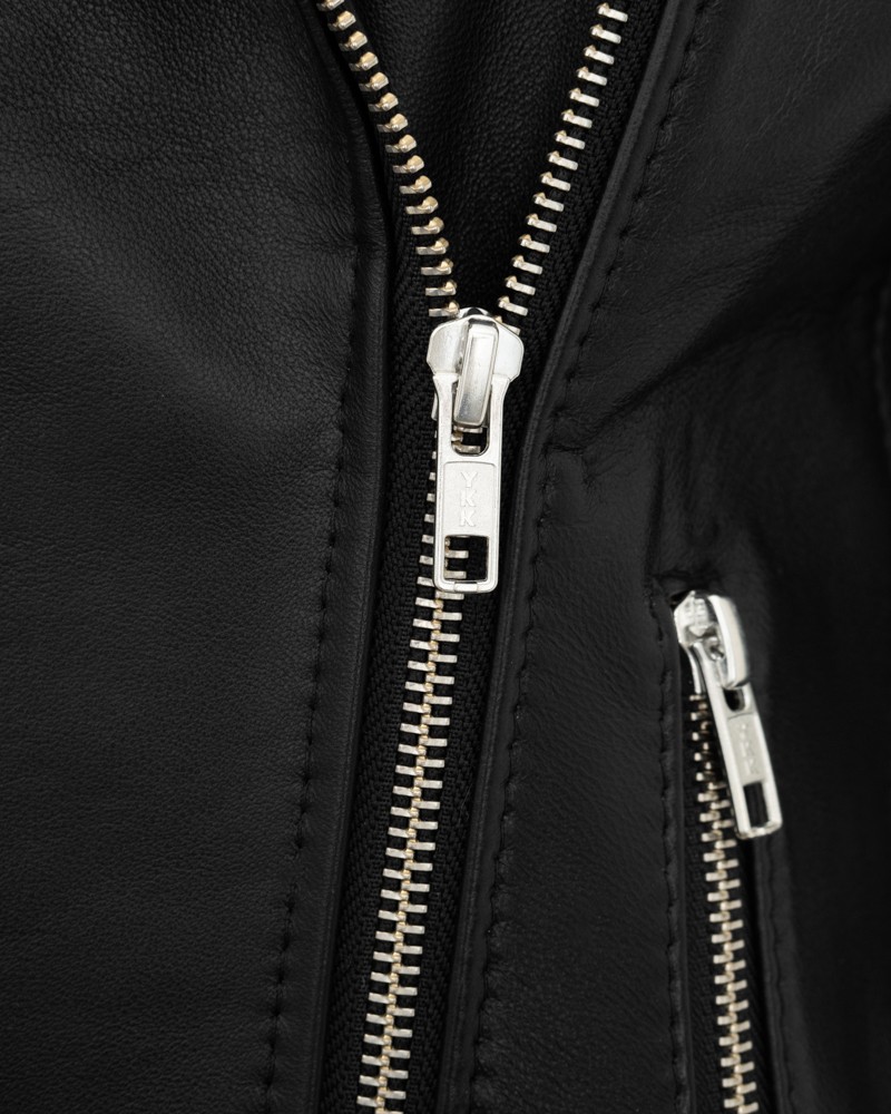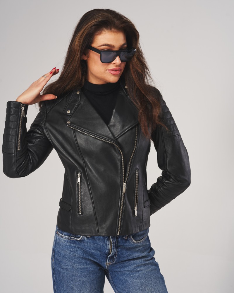Die Bikerjacken Damen Samira wurde in Polen aus vollständig natürlichem Lammleder gefertigt, das sich nicht nur durch außergewöhnliche Weichheit, sondern auch durch Haltbarkeit auszeichnet, die eine jahrelange Nutzung garantiert. Der stilvolle, umgelegte Kragen wird durch einen Kälteschutz-Stehkragen mit praktischem Druckknopf abgeschlossen. Die taillierte Passform liegt perfekt an der weiblichen Silhouette und betont subtil ihre Vorzüge.