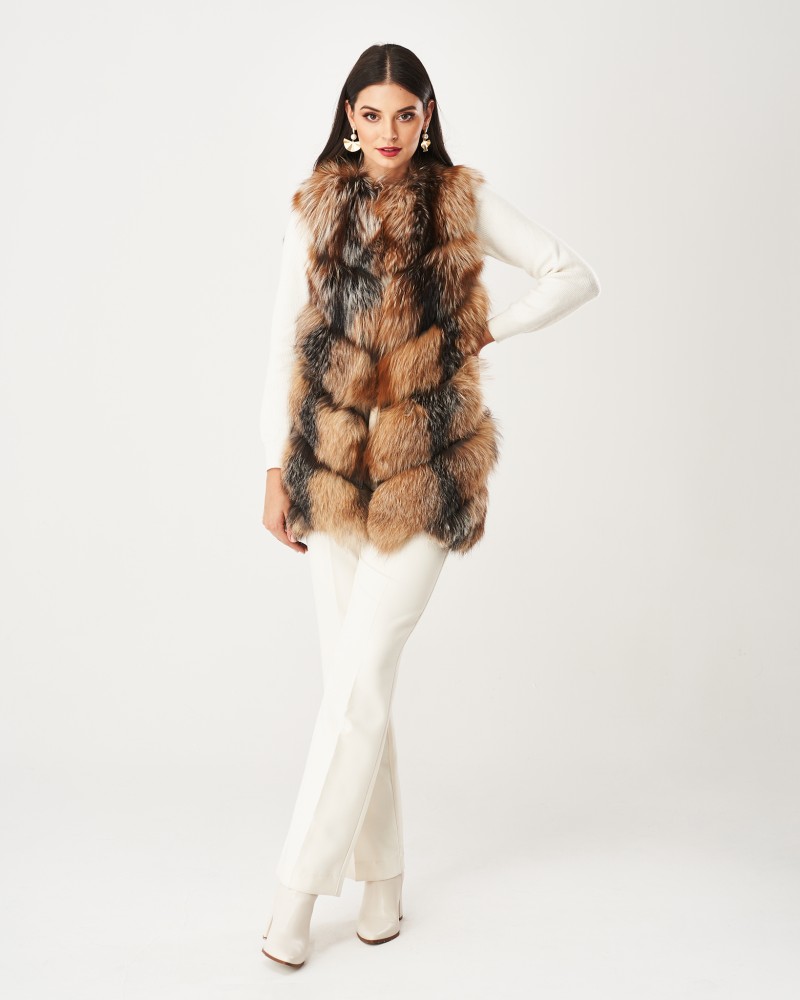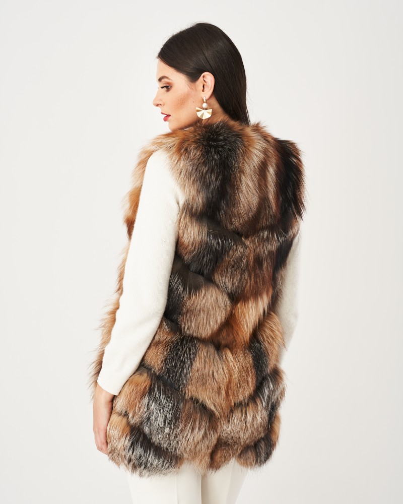Die Damen Fellweste aus Fuchspelz Hawana ist weich und flauschig, zeichnet sich durch einen natürlichen, dreifarbigen Ton und langes Fell aus, wodurch sie ein eindrucksvolles und stilvolles Erscheinungsbild bietet, vor Kälte an den kältesten Tagen des Jahres schützt und die Kreation vieler interessanter und eleganter Stylings ermöglicht.