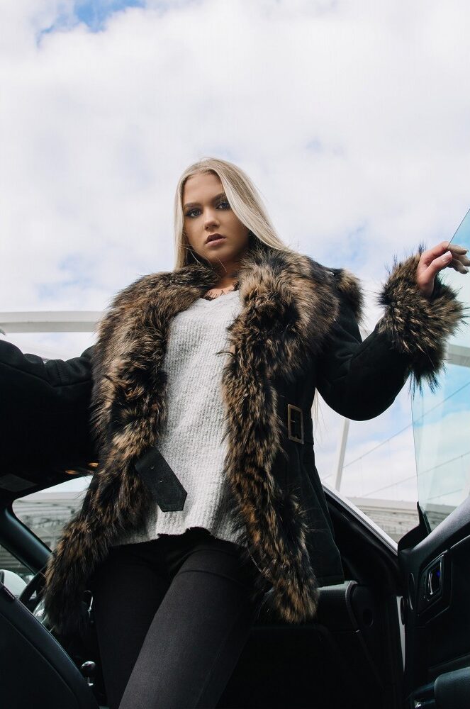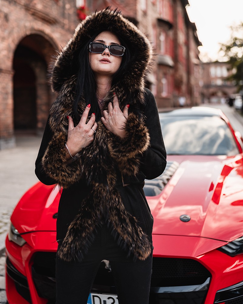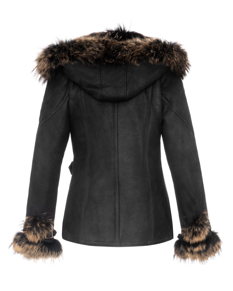 Damen Lammfelljacke Laura wurde aus natürlichem Schafsleder gefertigt, das gut am Körper anliegt und gleichzeitig große Bewegungsfreiheit garantiert. Die abnehmbare Kapuze bildet einen wunderschönen Schalkragen, der umso besonderer ist, da er – ebenso wie die Ärmelmanschetten – mit naturbelassenem Finnraccoon eingefasst ist, was einen spektakulären visuellen Effekt erzeugt und das Modell in der Menge durch Klasse und Eleganz hervorhebt. Die Jacke reicht bis zu den Hüften, wodurch sie deren Rundungen sanft betont und sich sowohl mit Jeans als auch mit engen Lederhosen hervorragend kombinieren lässt.