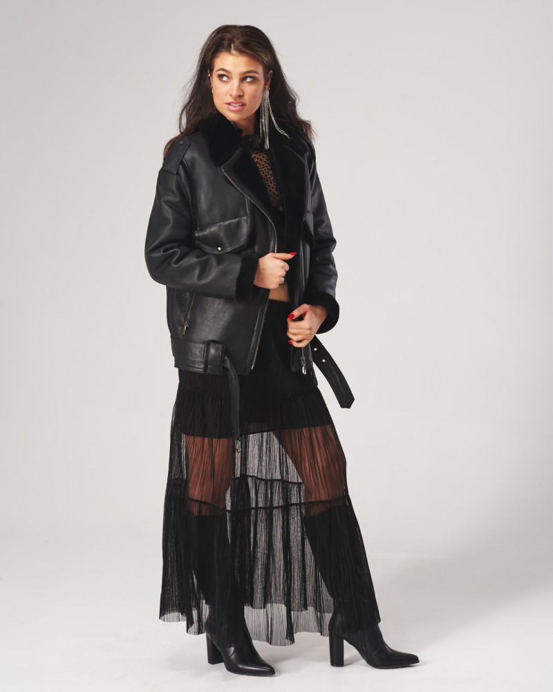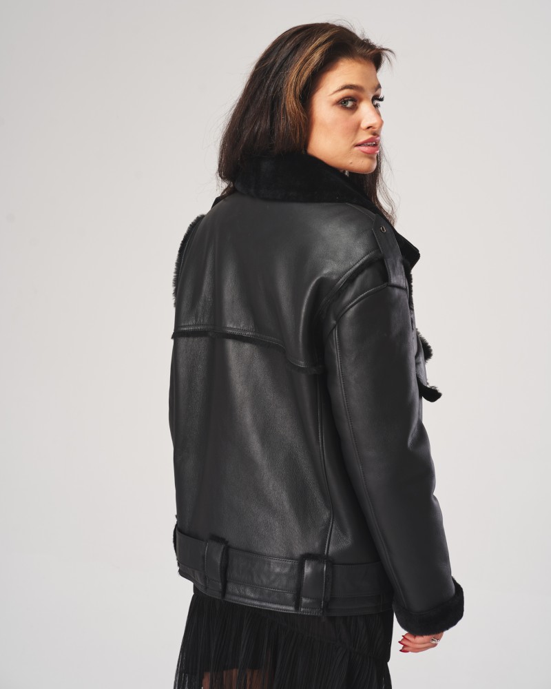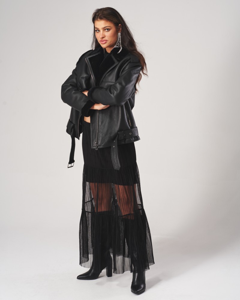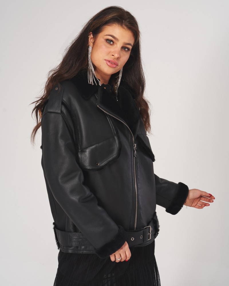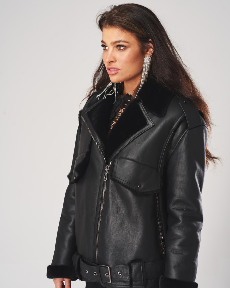 Die Damen Lammfelljacke Liza ist ein außergewöhnliches Modell in klassischer, dunkler Farbpalette und fügt sich daher perfekt in verschiedene Winteroutfits ein. Entworfen in einem zeitlosen, großzügigen Oversize-Schnitt, bietet sie unvergleichlichen Komfort, Bequemlichkeit und Bewegungsfreiheit und ermöglicht gleichzeitig das Tragen zusätzlicher Kleidungsschichten darunter an den kältesten Tagen des Jahres. Unten befindet sich ein Gürtel mit Schnalle in einer Farbe, die zum Rest des Designs harmoniert, welcher die Regulierung des Jackenumfangs für eine bessere Passform und zur Betonung der Figur erlaubt.