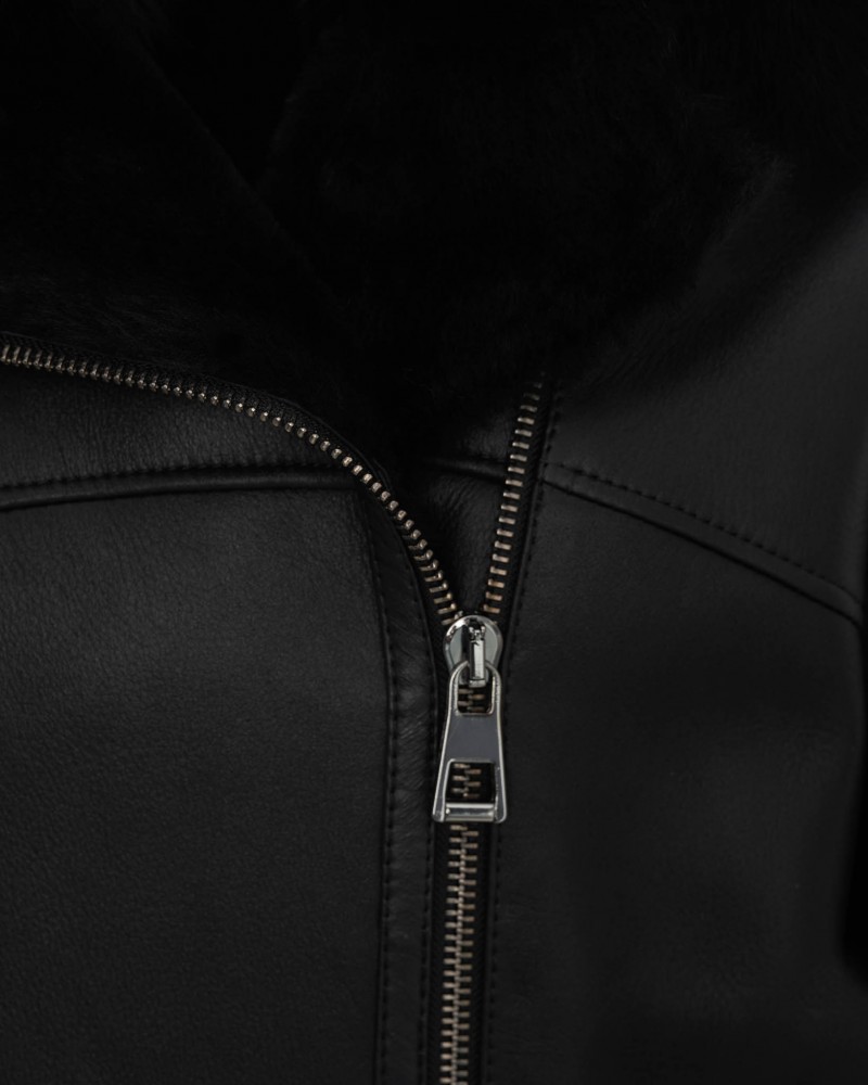 Damen Lammfelljacke Rumi verfügt über einen einfachen Schnitt bis zur Hüfte, weshalb sie einzigartigen Tragekomfort, Bequemlichkeit und Bewegungsfreiheit bietet. Die schwarze Farbgebung verleiht dem Modell Eleganz und sorgt dafür, dass die Jacke problemlos zu den meisten Outfits passt. Am Kragen sowie an den Ärmelbündchen befinden sich Fellbesätze aus echtem Fuchsfell, die dem Design einen unverwechselbaren Charakter und Exklusivität verleihen. Die Jacke wird mit einem leicht schräg eingearbeiteten, reibungslos laufenden Reißverschluss aus Edelstahl geschlossen.