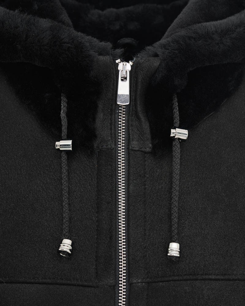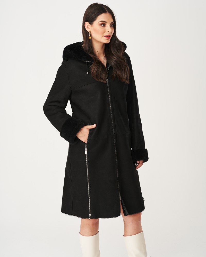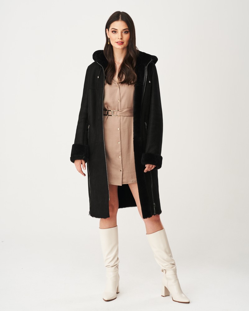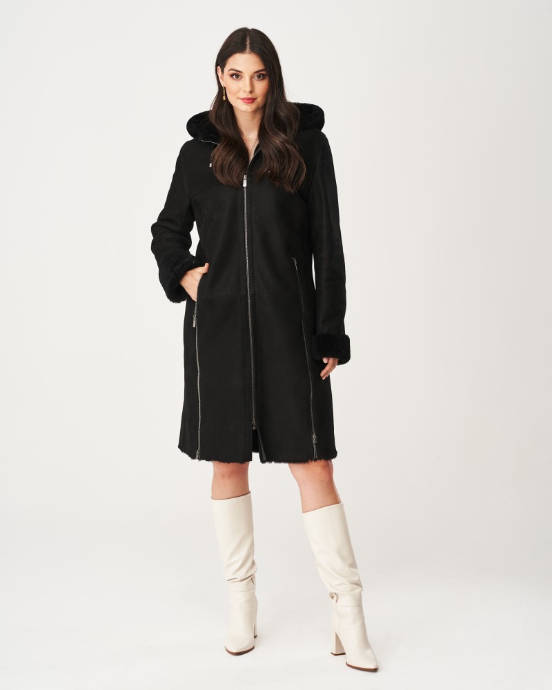 Damen Lammfellmantel Greta verfügt über eine leicht taillierte Passform, die bis zum Knie reicht, sowie über eine praktische und funktionale Kapuze mit Kordelzug. Sowohl an der Kapuze als auch an den Ärmeln befinden sich Einsätze aus Das Modell wird mit einem robusten Reißverschluss aus Edelstahl geschlossen, ebenso wie die seitlichen Taschen. Besonders hervorzuheben ist der Reißverschluss, der an beiden Seiten von unten entlangläuft und eine Verlängerung des Reißverschlusses an den Taschen bildet. Beim Öffnen erhältst du deutlich mehr Bewegungsfreiheit und steigerst den Tragekomfort des Lammfellmantels noch weiter.
