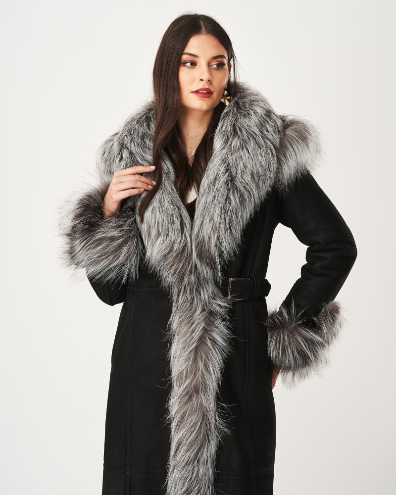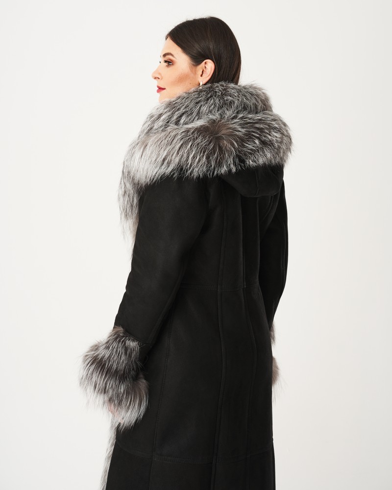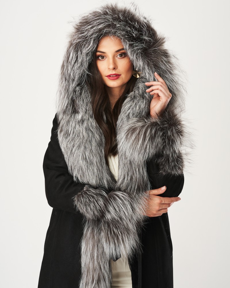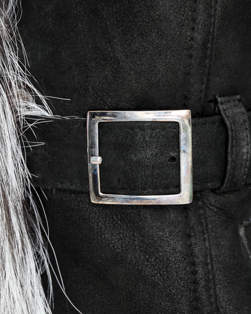Damen Lammfellmantel Karen hat einen schlichten, zeitlosen Schnitt sowie einen bequemen Verschluss mit fest angenähten Knöpfen. In der Taille befindet sich ein Gürtel mit eleganter Schnalle, mit dem du die Figur perfekt betonst. Ähnliche Schnallen sind an den Ärmeln angebracht, sodass du deren Umfang frei regulieren kannst. Herzstück des Designs sind Einsätze aus Silberfuchs, die an den Ärmeln und der weiten, hervorragend vor schlechtem Wetter schützenden Kapuze angebracht sind, von der weiches, angenehmes Fell fast bis zum Boden entlang einer Vorderseite verläuft. Solche Details sorgen dafür, dass das Modell besonders elegant wirkt und dich wie einen Filmstar fühlen lässt.