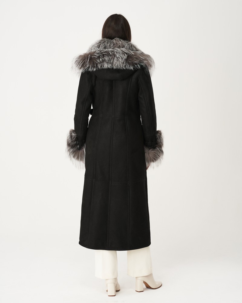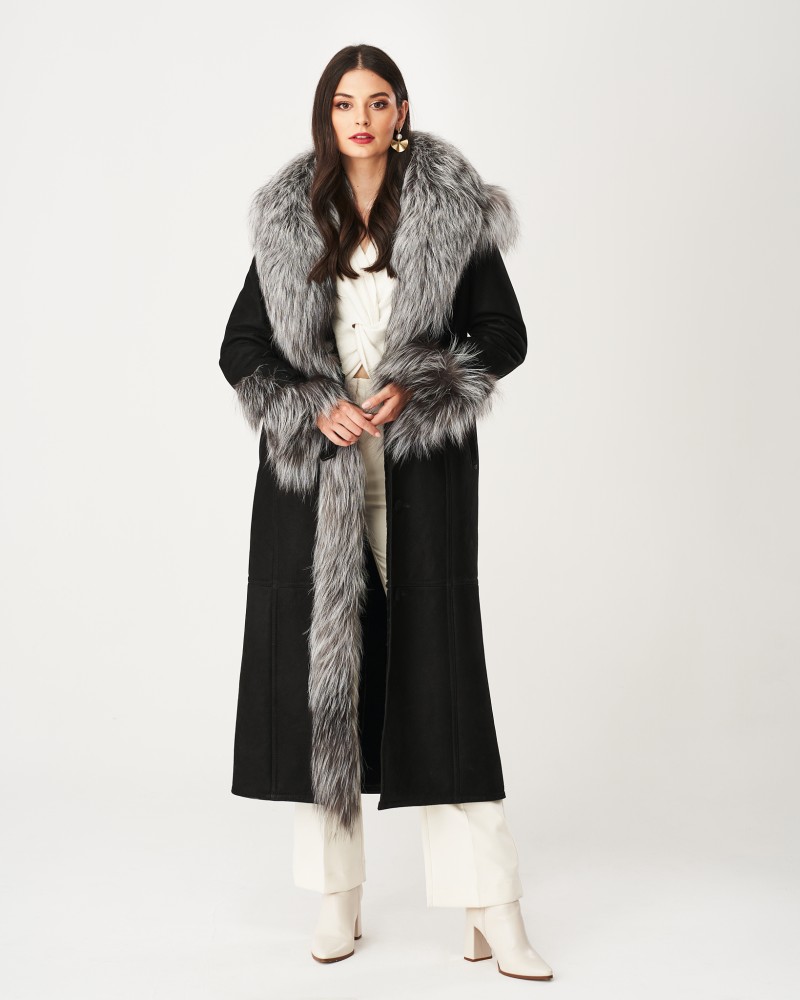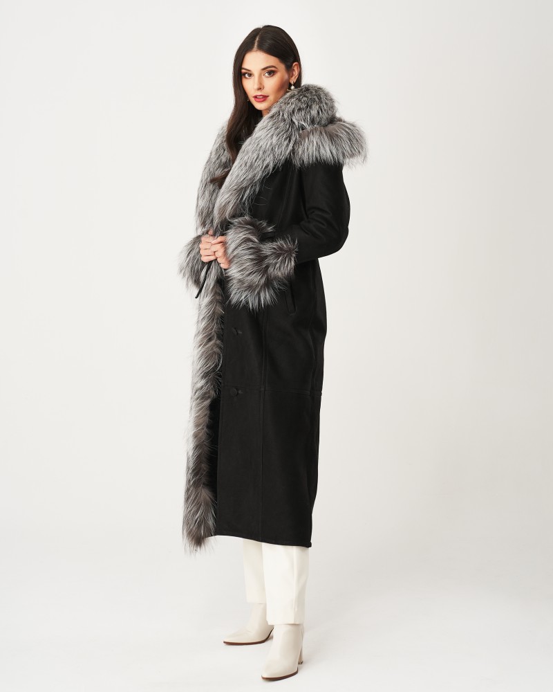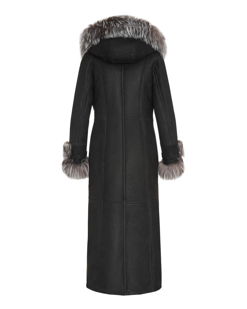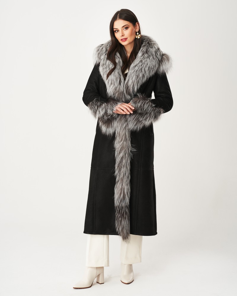Damen Lammfellmantel Karen hat einen schlichten, zeitlosen Schnitt sowie einen bequemen Verschluss mit fest angenähten Knöpfen. In der Taille befindet sich ein Gürtel mit eleganter Schnalle, mit dem du die Figur perfekt betonst. Ähnliche Schnallen sind an den Ärmeln angebracht, sodass du deren Umfang frei regulieren kannst. Herzstück des Designs sind Einsätze aus Silberfuchs, die an den Ärmeln und der weiten, hervorragend vor schlechtem Wetter schützenden Kapuze angebracht sind, von der weiches, angenehmes Fell fast bis zum Boden entlang einer Vorderseite verläuft. Solche Details sorgen dafür, dass das Modell besonders elegant wirkt und dich wie einen Filmstar fühlen lässt.