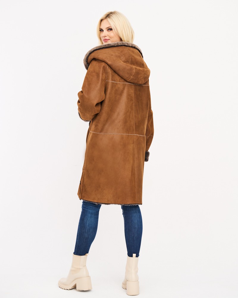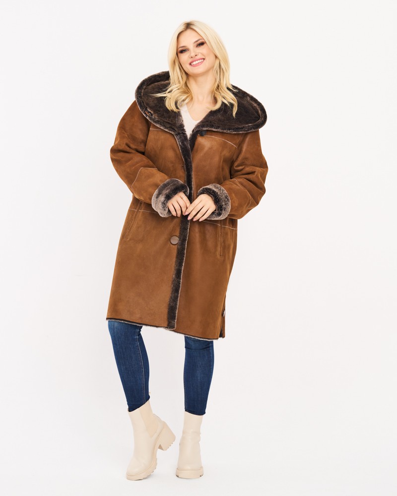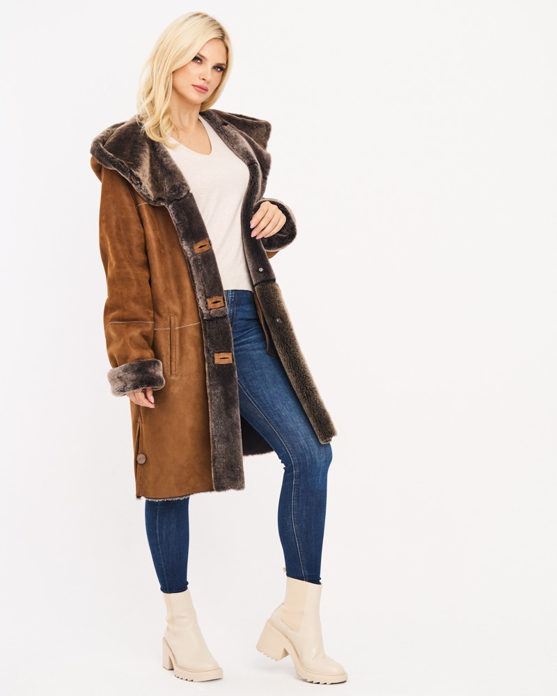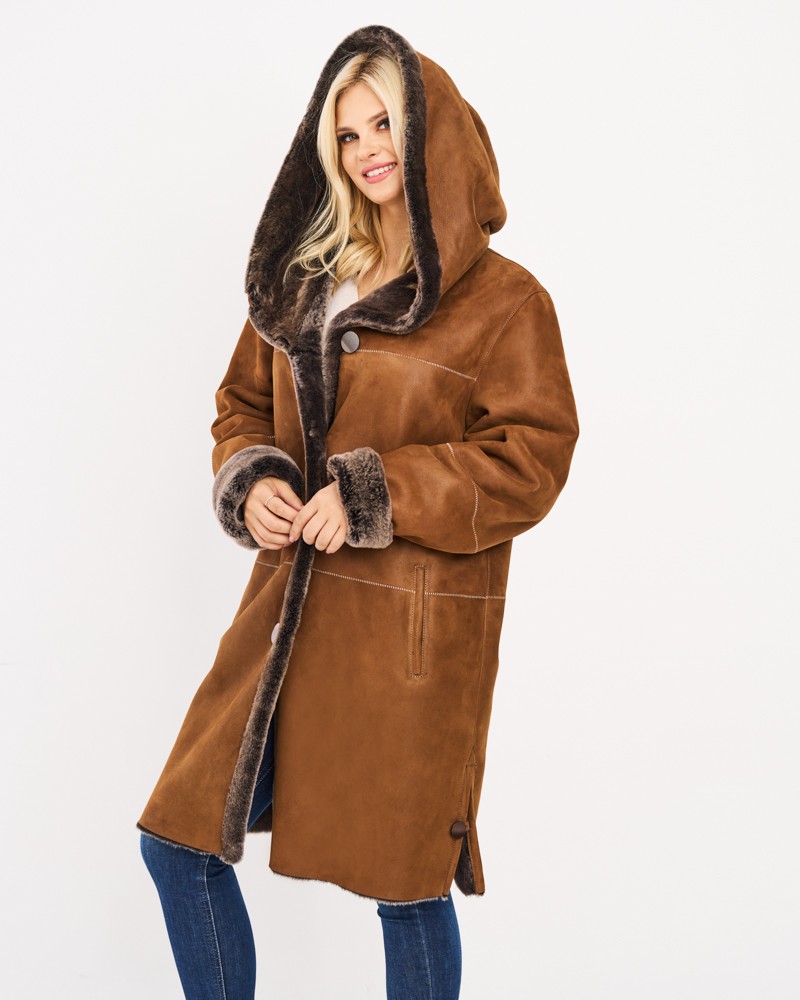 Der natürliche Damen Lammfellmantel London bietet vor allem einzigartigen Tragekomfort, auf den Sie auch an den kältesten Tagen des Jahres nicht verzichten müssen. Der modische Oversize-Schnitt liegt hervorragend auf jeder Körperform, sorgt für Bewegungsfreiheit und Komfort und – dank der praktischen knieumspielenden Länge – kaschiert eventuelle Figurmakel und verleiht Ihnen Selbstvertrauen, unabhängig von den Umständen. Die schöne, braune Farbe des Modells wird leicht durch dunklere Einsätze aus weichem Fell entlang der Kanten des Lammfellmantels sowie an den Ärmelbündchen und der Kapuze akzentuiert.