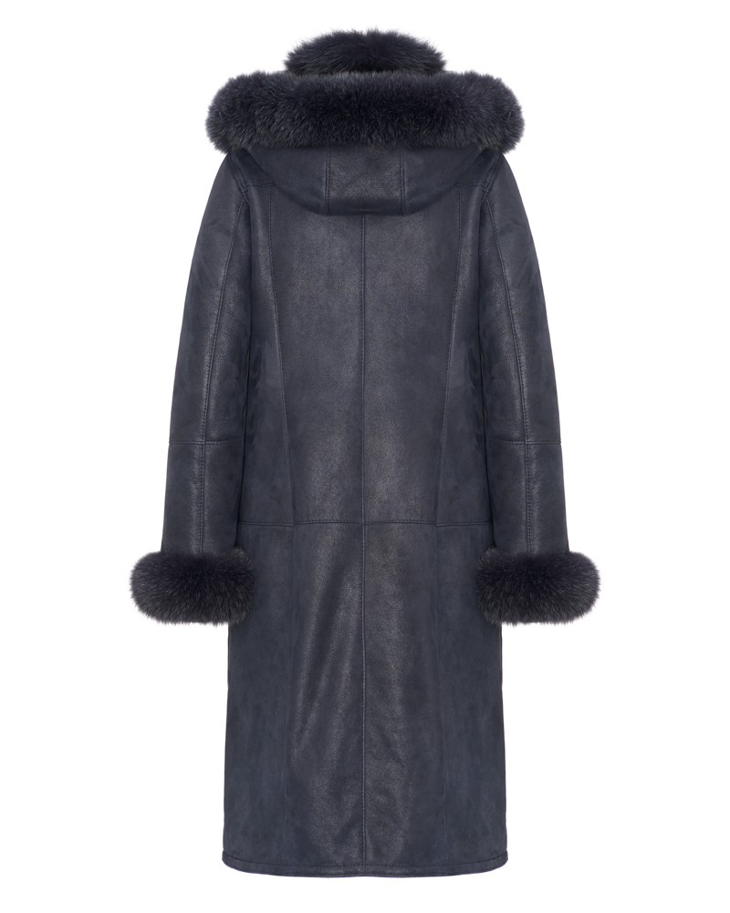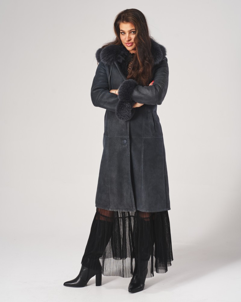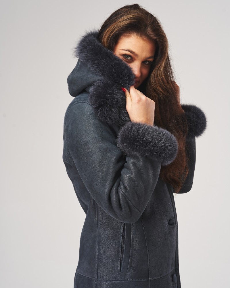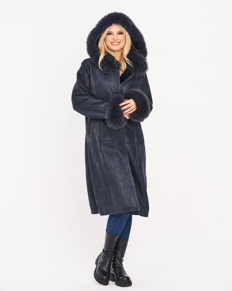 Der Damen Lammfellmantel Magda besitzt eine lockere, bewegungsfreundliche Passform, die auf jeder Figur schön sitzt. Die Länge des Modells bis zur Mitte der Waden schlankt und streckt die Silhouette optisch. Der Knopfverschluss ist praktisch und orientiert sich an klassischen Modellen dieser Kleidungsart. Auffällige horizontale und vertikale Nähte entlang der gesamten Länge des Mantels, der Kapuze und der Ärmel verleihen ihm einen besonderen Charakter.