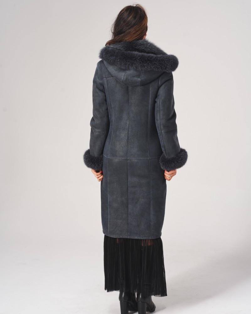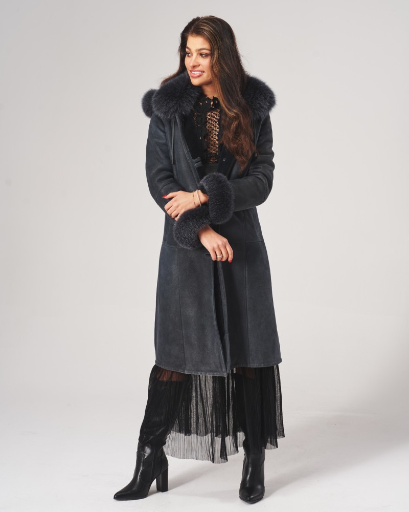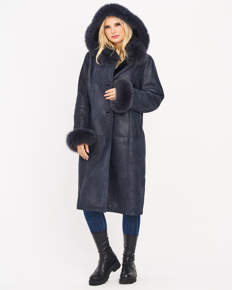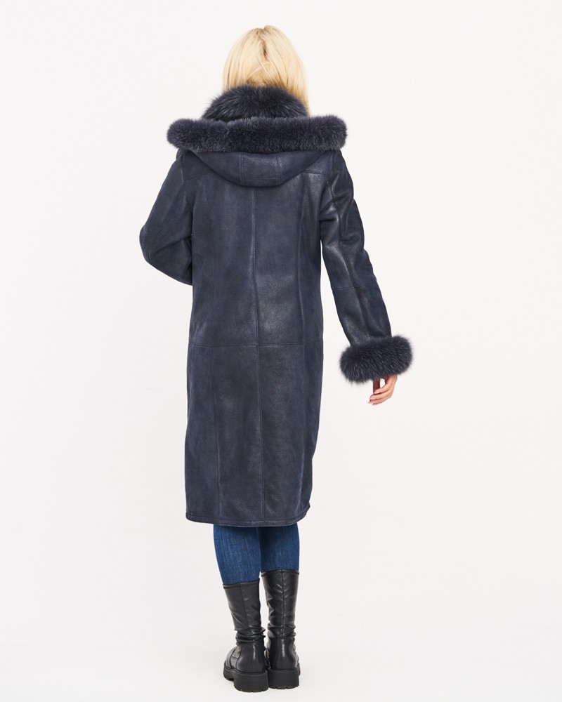 Der Damen Lammfellmantel Magda besitzt eine lockere, bewegungsfreundliche Passform, die auf jeder Figur schön sitzt. Die Länge des Modells bis zur Mitte der Waden schlankt und streckt die Silhouette optisch. Der Knopfverschluss ist praktisch und orientiert sich an klassischen Modellen dieser Kleidungsart. Auffällige horizontale und vertikale Nähte entlang der gesamten Länge des Mantels, der Kapuze und der Ärmel verleihen ihm einen besonderen Charakter.