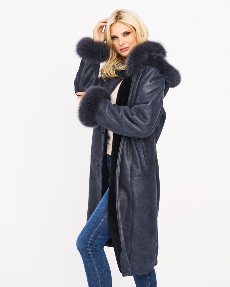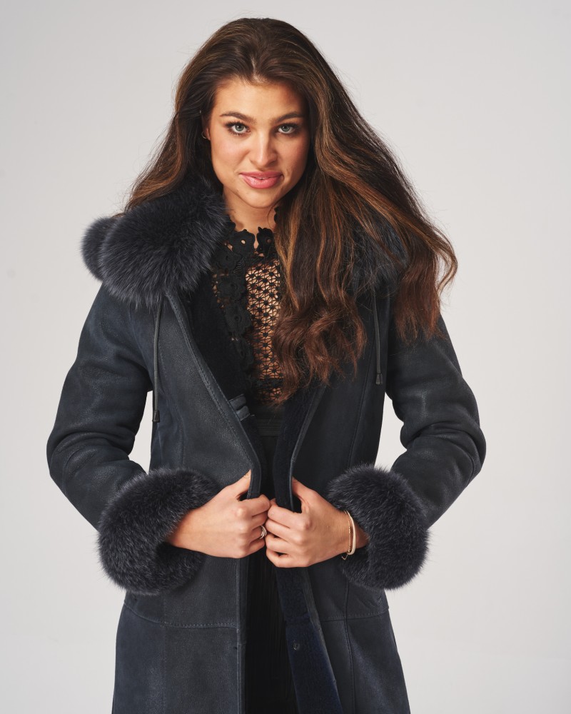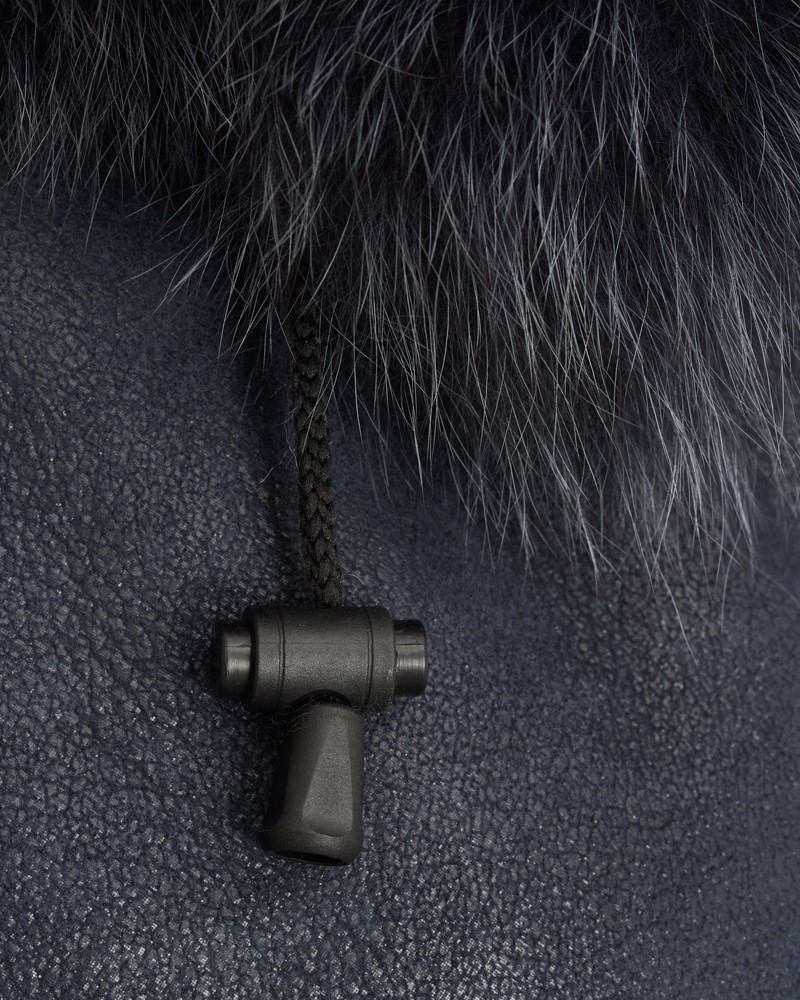 Zwei kaum sichtbare, seitliche Taschen, schräg eingesetzt, ermöglichen es, die kalten Hände an frostigen Tagen zu wärmen. Der Damen Lammfellmantel Magda verfügt über einen umlegbaren Fuchskragen, der den Hals warm umschließt. Die Manschetten der langen Ärmel sind ebenfalls mit Fuchs besetzt, und der abnehmbare Kapuzenaufsatz ist damit verziert und zusätzlich mit praktischen Stoppern zur individuellen Einstellung ausgestattet.