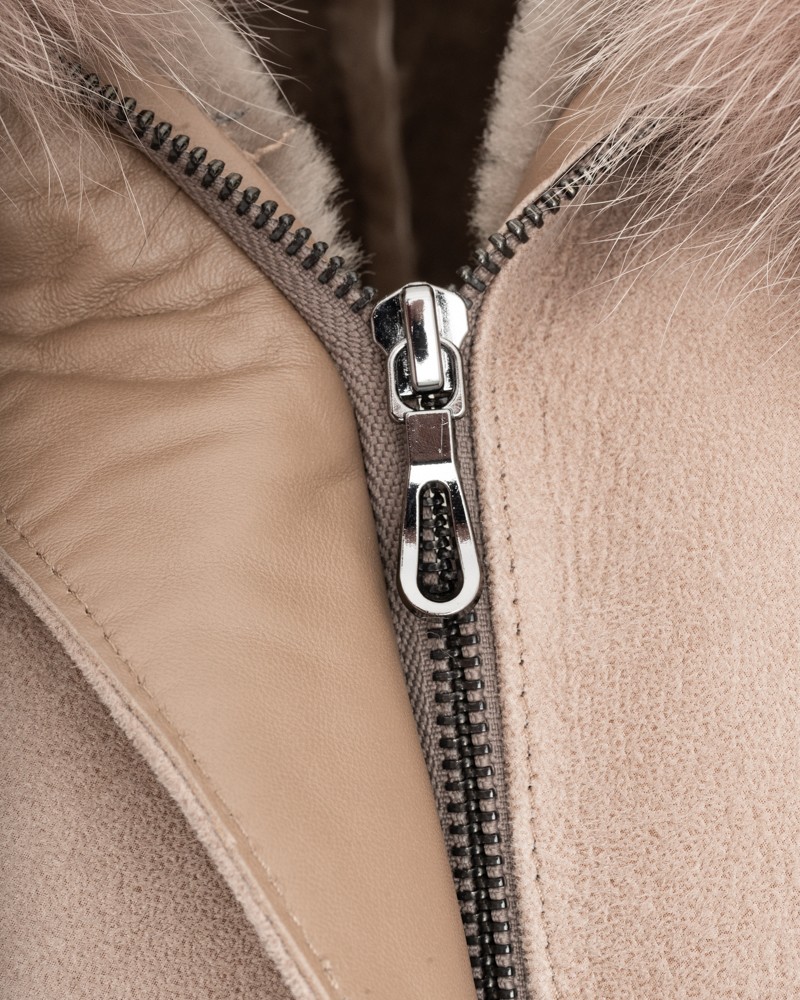 Damen Lammfellmantel Maja wird mit einem praktischen und langlebigen Reißverschluss aus Edelstahl geschlossen, der hinter einer eleganten, dekorativen Blende verborgen ist, die genau über die Mitte des Mantels verläuft. Die Einzigartigkeit dieses Modells wird durch die funktionale Kapuze unterstrichen, reichlich mit natürlichem, weichem Fuchs besetzt, sowie durch die charmanten Manschetten, veredelt mit zeitlosem und stets modischem Pelz.