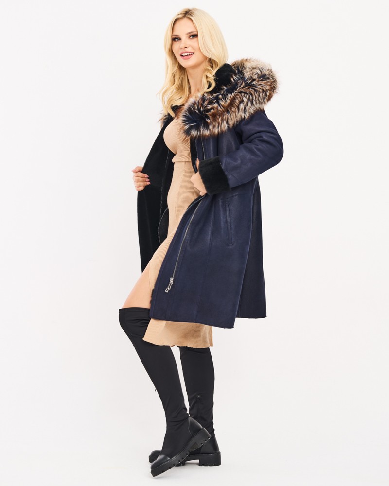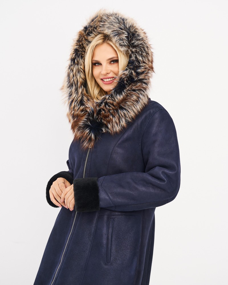 Der Damen Lammfellmantel Nessa verfügt über einen einfachen Schnitt, der bis über das Knie reicht und sich perfekt an jede Körperform anpasst, die Figur optisch schlank wirken lässt. Ein beidseitiger Reißverschluss aus langlebigem Edelstahl verläuft leicht seitlich, was ein außergewöhnliches Design des Modells schafft. Die vor Kälte schützende Kapuze formt einen eleganten, umgelegten Kragen, sorgfältig mit weichem, natürlichem Fuchs besetzt. Das Gesamtdesign wird durch modisch mit Fell veredelte Ärmelabschlüsse abgerundet.