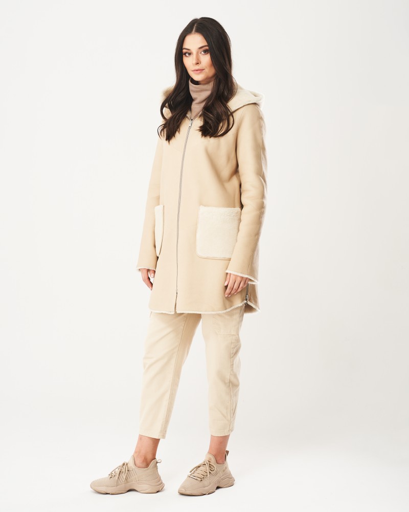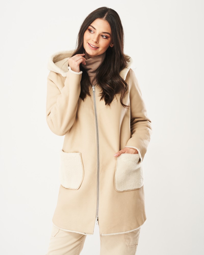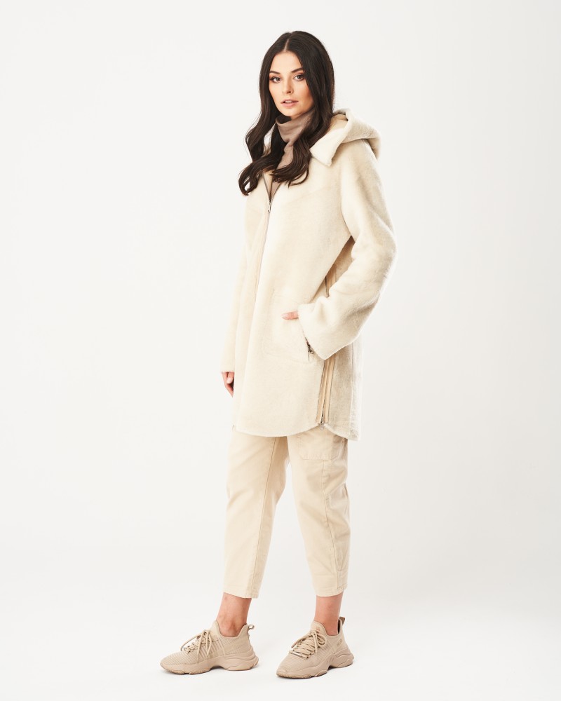 Damen Lammfellmantel Sindi besticht durch eine charmante, helle Farbgebung, einen einfachen Schnitt, der maximalen Tragekomfort bietet, sowie durch eine Länge, die über die Hüften reicht. Er wird mit einem robusten Reißverschluss aus Edelstahl verschlossen. Ein ähnlicher Reißverschluss befindet sich auch in zwei praktischen Seitentaschen sowie an den Seiten. Letzteres ermöglicht Ihnen mehr Bewegungsfreiheit und ist ideal, wenn Sie darunter eine dickere Kleidungsschicht tragen.