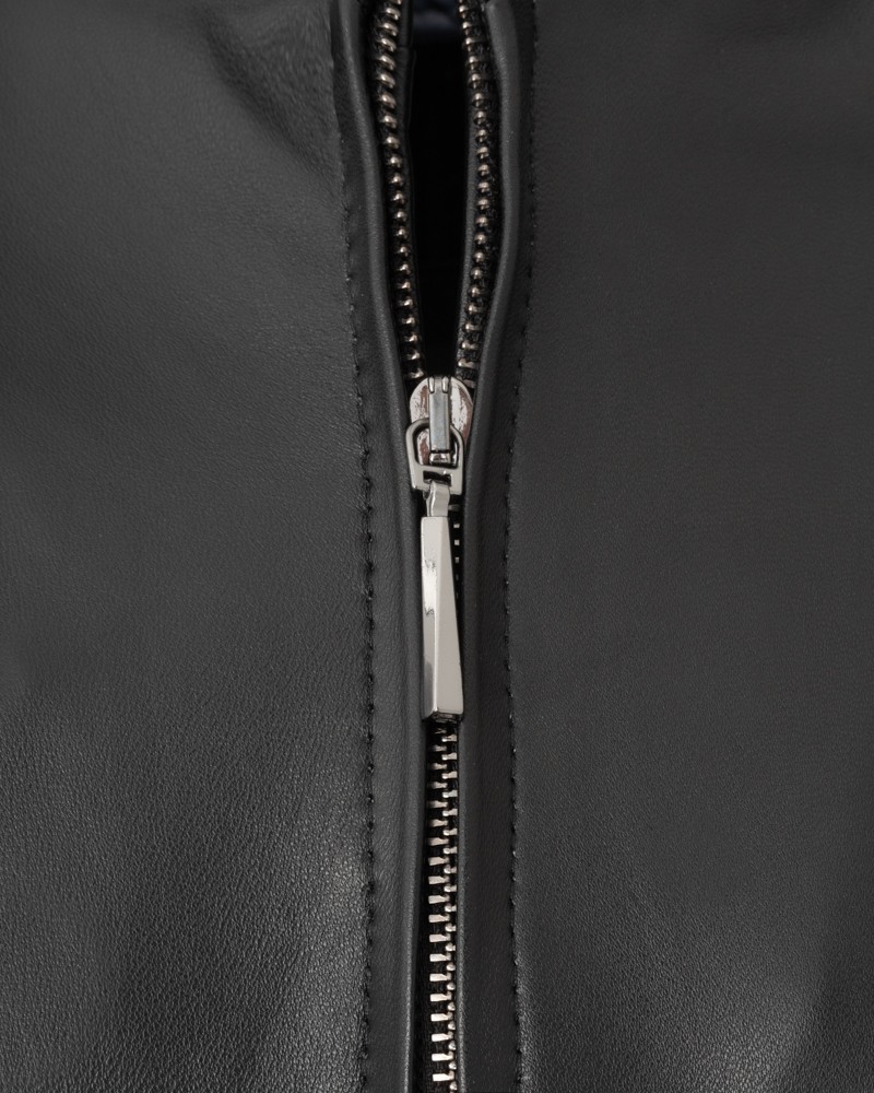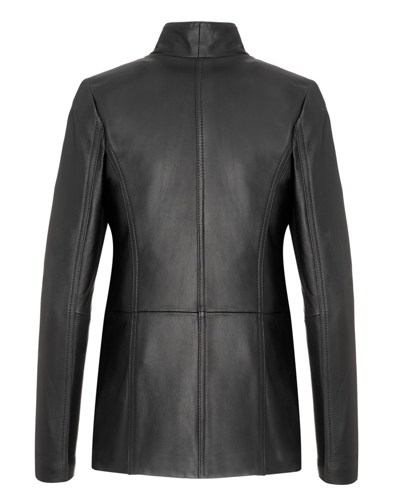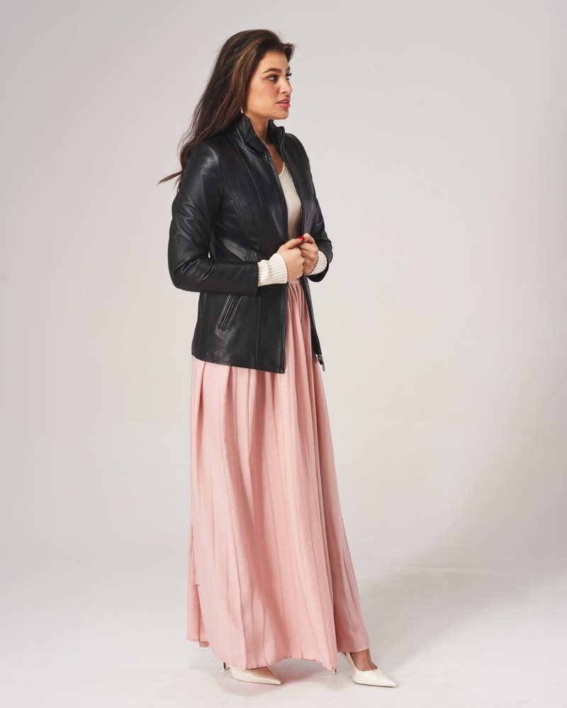 Damen Lederjacken Amber hat einen klassischen, leicht taillierten Schnitt und die bei Frauen beliebte Länge, die Hüften und Gesäß bedeckt. Dieses Modell schlankt die Silhouette optisch und kaschiert perfekt eventuelle Figurmakel. Über die gesamte Länge mit einem Reißverschluss ausgestattet, besitzt sie einen hohen Stehkragen, der sich zu einem Kragen öffnen lässt. Lange, bequeme und bewegungsfreundliche Ärmel verjüngen sich nach unten. Originelle Steppnähte verleihen der Jacke Charakter. Zwei seitliche Reißverschlusstaschen schmücken die Vorderseite.