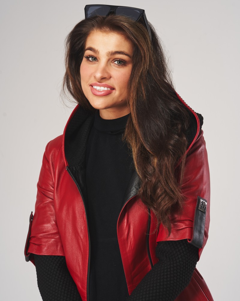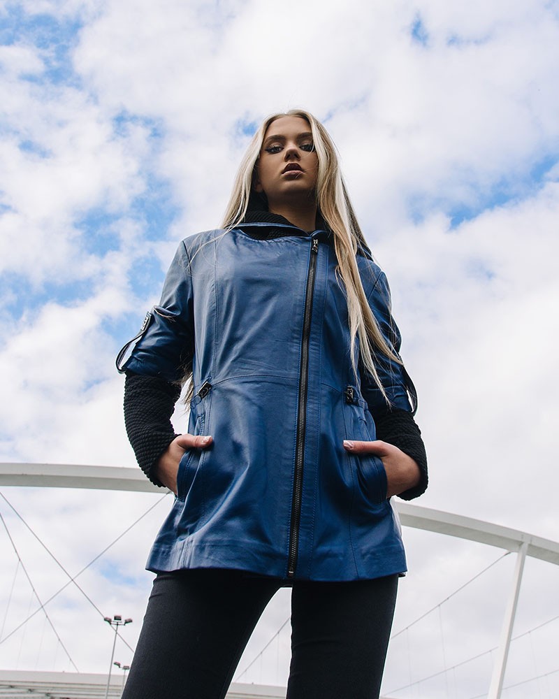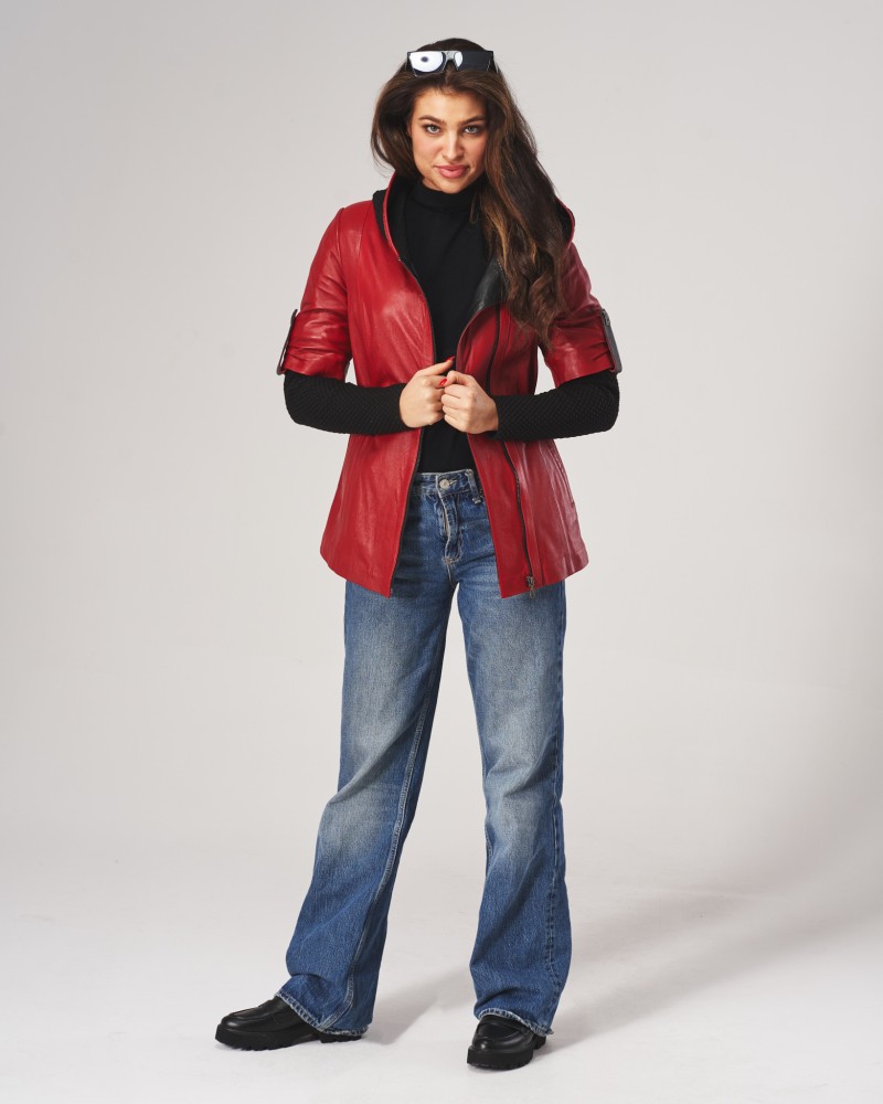 Damen Lederjacken Bella verfügt über ein interessantes Design, zu dem unter anderem farblich abgesetzte Stoffeinsätze gehören. An den Ärmeln befinden sich durchbrochene Metallverzierungen, und der leicht asymmetrisch eingesetzte Reißverschluss harmoniert perfekt mit dem Gesamtdesign. Wenn es kühler wird, kannst du dir die praktische, bequeme Kapuze überziehen. Die Jacke hat eine feminine, leicht taillierte Passform und reicht bis zur Hüfte. Nutze die Kordeln in der Taille, um den Umfang zu regulieren, und hervorzuheben, die Rundungen deiner Figur stärker zu betonen.