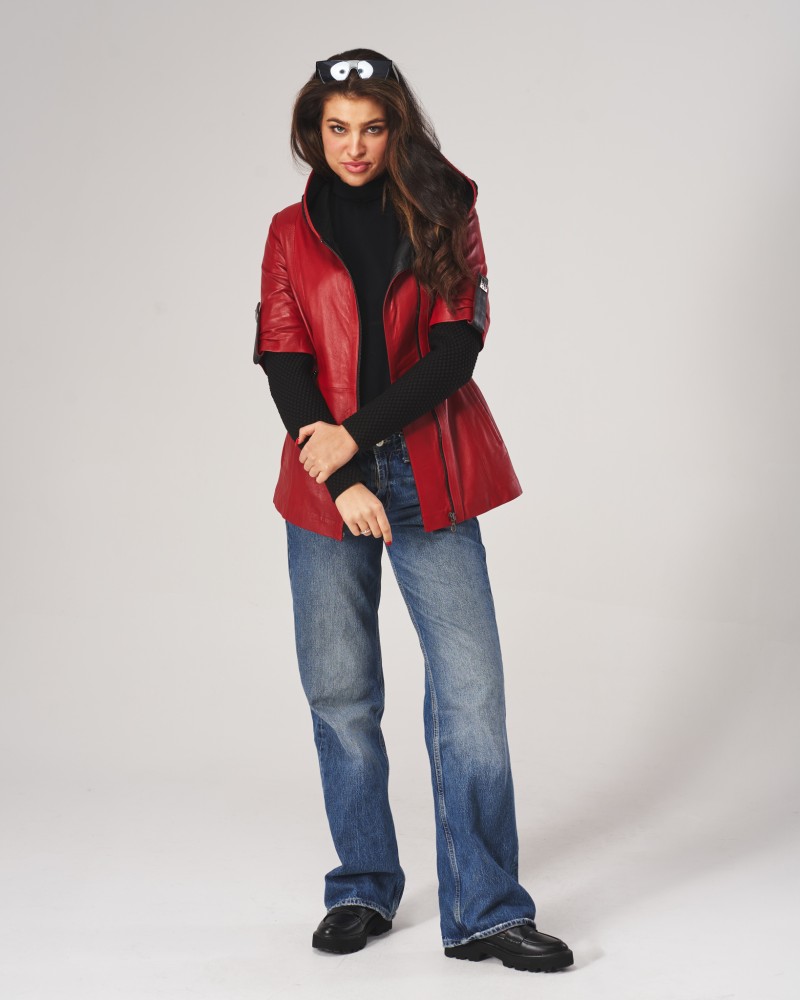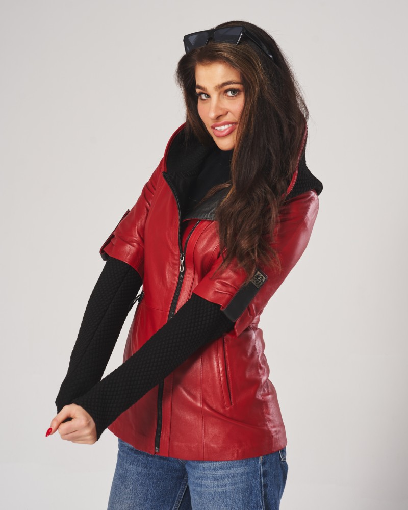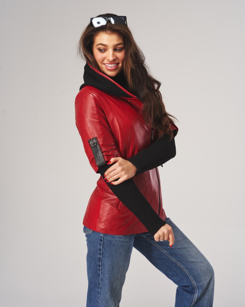 Äußerst praktisch, innovativ gestaltete Damen Lederjacken Bella, gefertigt aus natürlichem Lammleder und elastischem Material, die sich durch Abnehmen der Ärmel mühelos in ein originales Lederhemd verwandeln lässt. Stilvolle Akzente in Form von durchbrochenen Metallverzierungen an den Ärmeln, asymmetrisch eingenähtem Reißverschluss oder Kordeln in der Taille, die die Figur betonen, erhöhen die Attraktivität dieses Modells noch weiter.