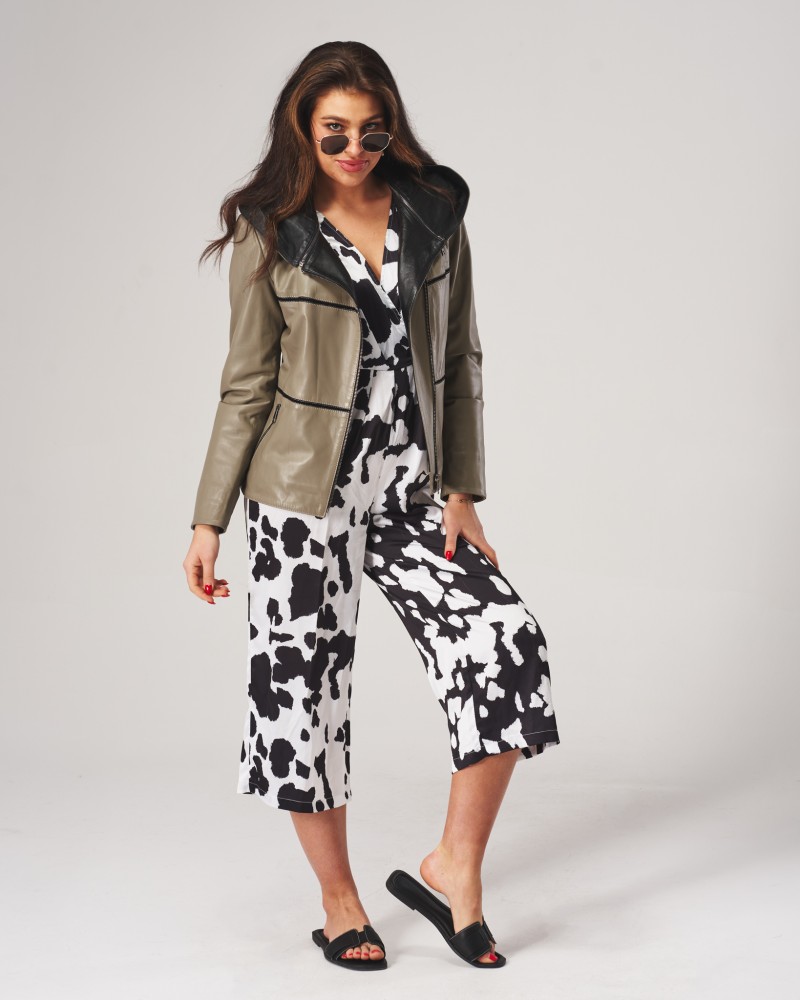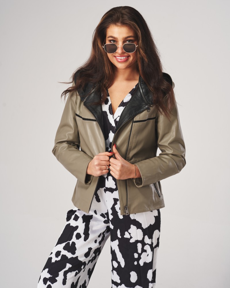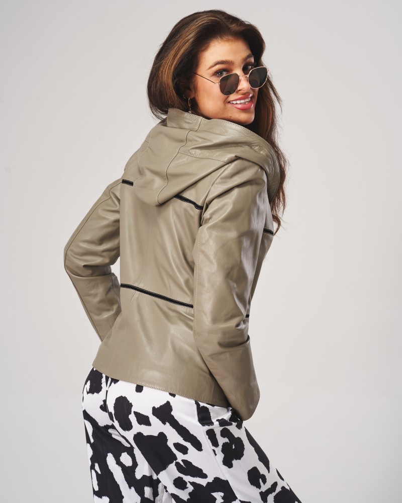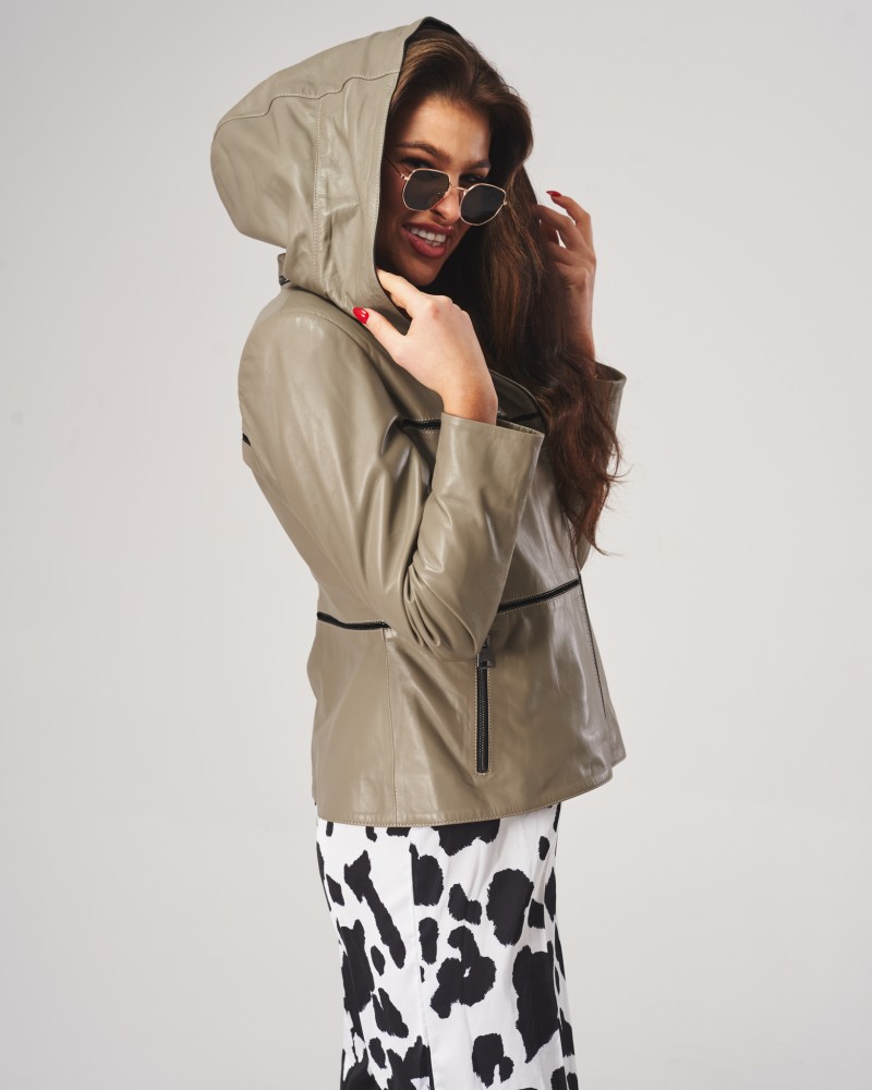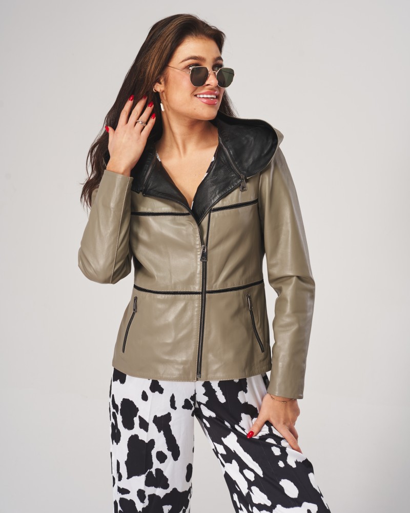 Damen Lederjacken Hinda wurde unter Berücksichtigung der unterschiedlichen Modepräferenzen jeder Frau entworfen, sodass sie in traditioneller Form mit Kapuze und Stehkragen oder in der eleganteren Chanel-Variante getragen werden kann. Diese einzigartige Transformation kann ganz einfach erreicht werden, indem man Kapuze und Stehkragen abnimmt. Diese designtechnische Lösung unterstreicht die Vielseitigkeit und Praktikabilität der Jacke, die sich perfekt an verschiedene Anlässe und Jahreszeiten anpasst. Dadurch hebt sich das Modell von anderen ab und wird zu einem vielseitigen Bestandteil jeder Damen Garderobe.