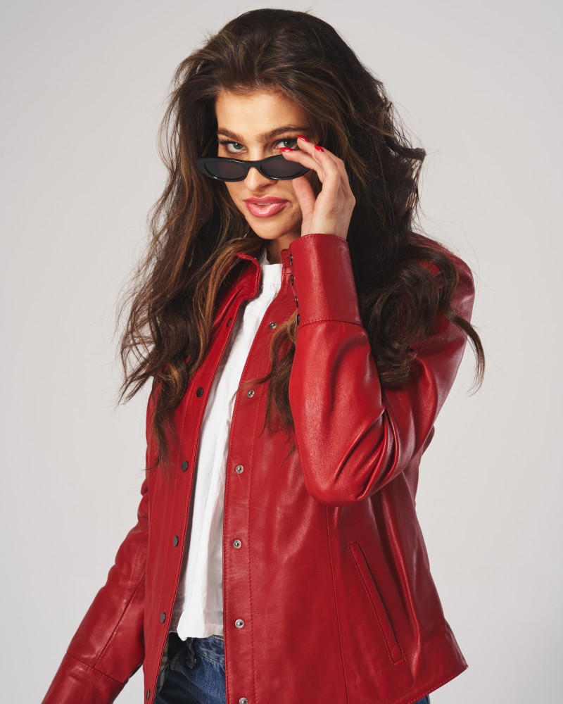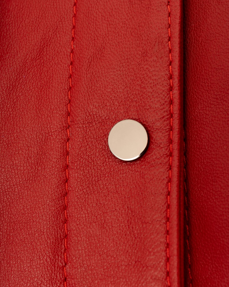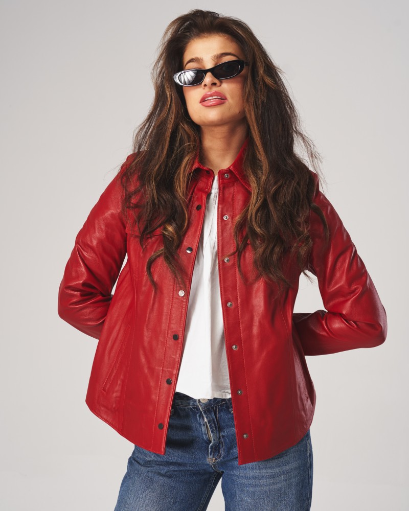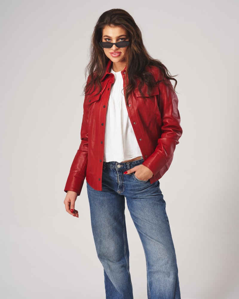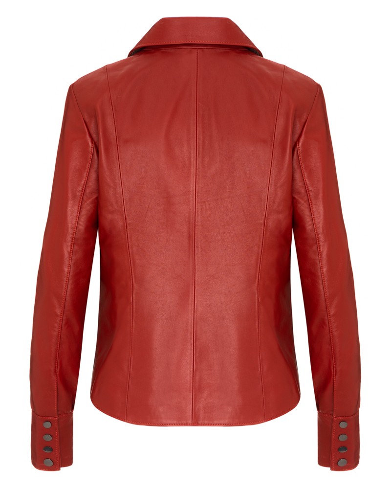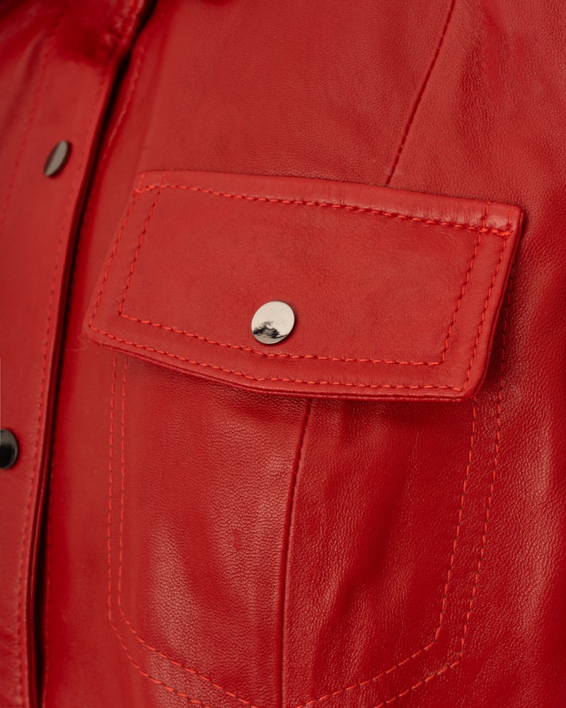 Damen Lederjacken Laila verfügt über interessante Akzente in Form von paarigen Brusttaschen mit Druckknopfverschluss sowie ebenso funktionalen Seitentaschen. Der aufklappbare Kent-Kragen ist ebenfalls mit einem Druckknopf ausgestattet, der bei ungünstiger Witterung besseren Schutz vor Wind und Kälte ermöglicht. Das gesamte Modell wird ebenfalls mit funktionalen Druckknöpfen verschlossen, die farblich interessant vom Rest des Designs abgesetzt sind.