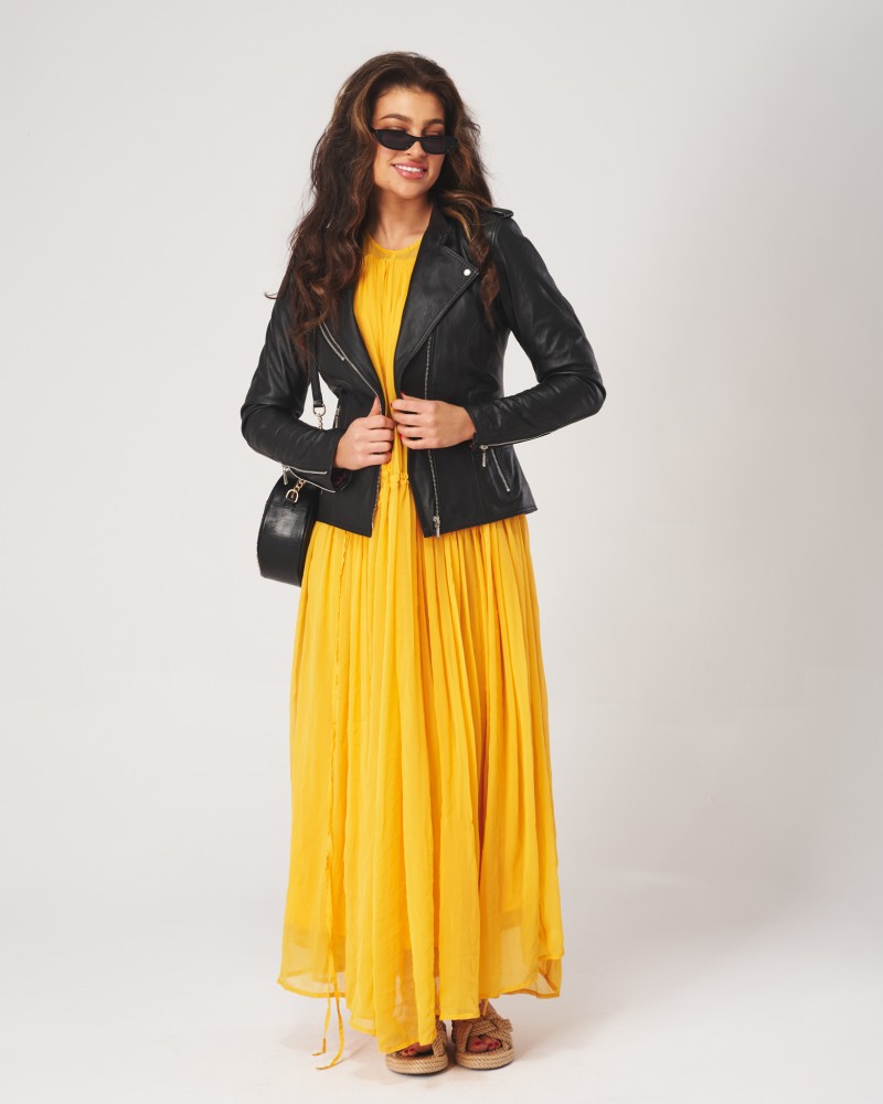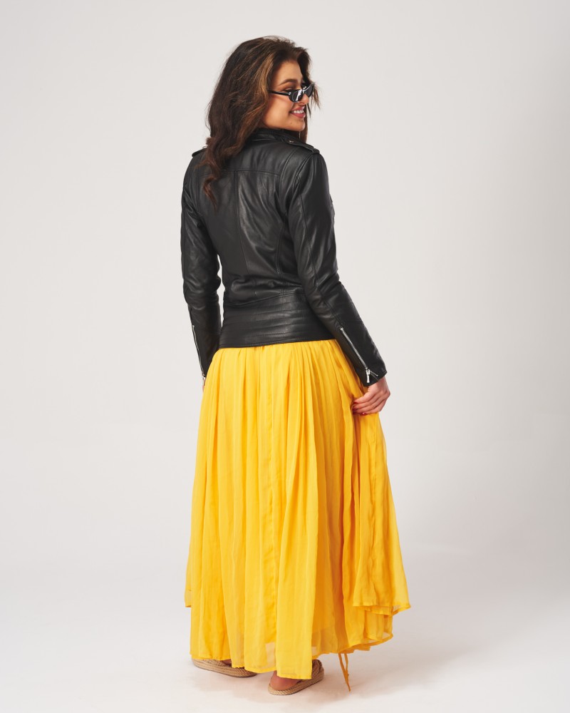 Damen Lederjacken Lara sind ein Modell im Stil der Bikerjacke und besitzen alle notwendigen Merkmale dieses Stils. Besonders auffällig ist die große Anzahl charakteristischer Elemente der Bikerjacke, die mit Reißverschlüssen versehen sind. Diese befinden sich nicht nur vorne, sondern sind auch in praktische Seitentaschen eingearbeitet und verzieren beide Ärmel, wodurch ein einzigartiger visueller Effekt entsteht.