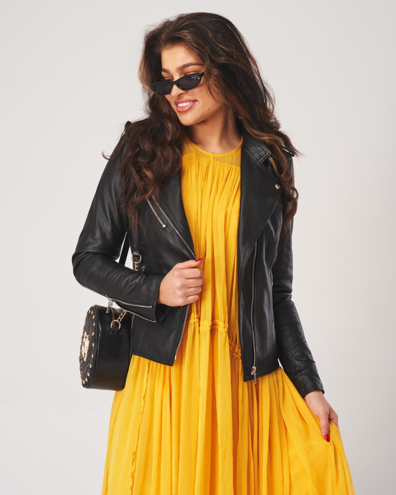 Damen Lederjacken Lara sind in einem schwarzen Farbton gefertigt, weshalb sie mit Eleganz und minimalistischem Stil begeistern und zu den meisten Outfits passen. Die Verwendung von leicht glänzendem, weichem, natürlichem Lammleder verleiht dem Modell einen unverwechselbaren Charakter und Raffinesse. Der leicht taillierte Schnitt unterstreicht wunderschön die Vorzüge der weiblichen Silhouette und endet auf Hüfthöhe.