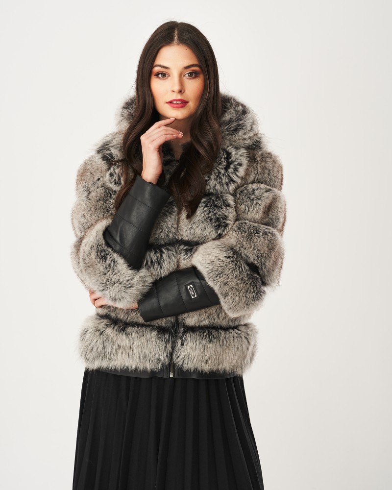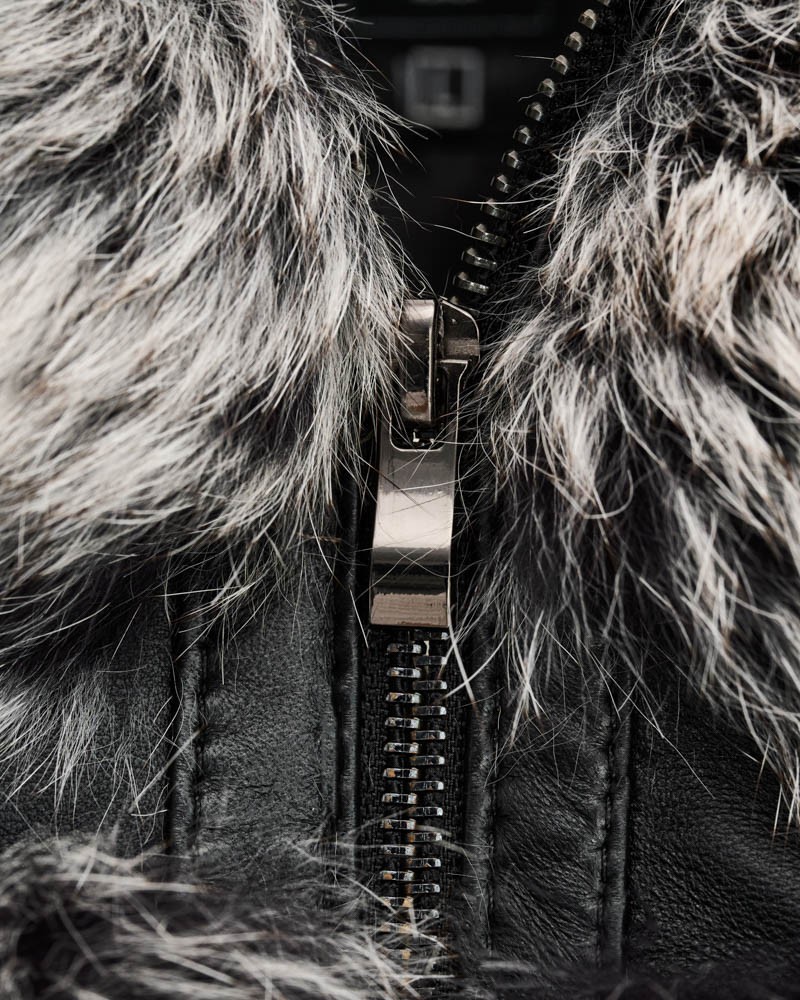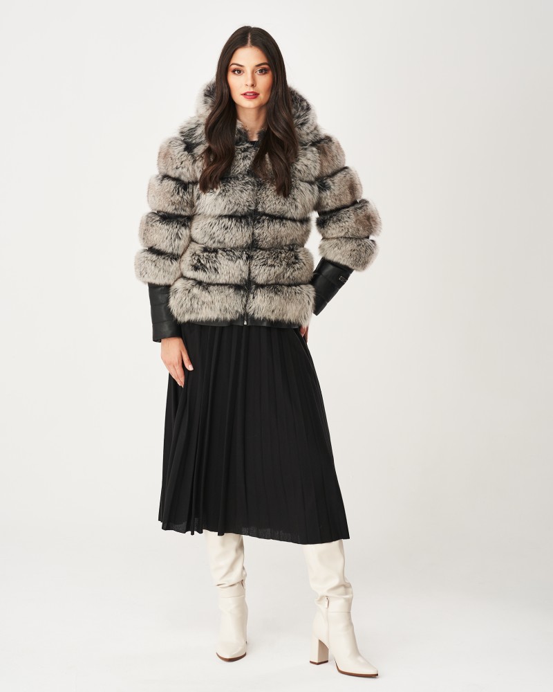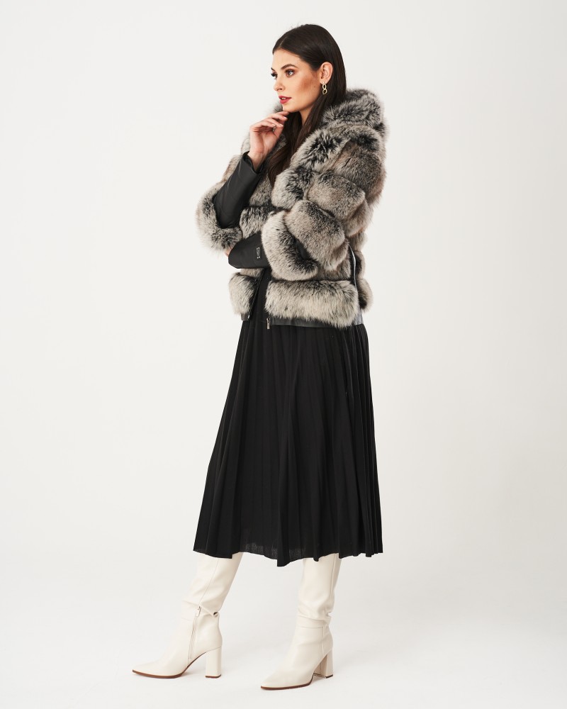 Damen Lederjacken Omena wurde in Hüftlänge entworfen, und der lockere Schnitt garantiert außergewöhnliche Bewegungsfreiheit und Lässigkeit. Die großzügige Kapuze aus Fuchspelz schützt auch den Kopf vor Kälte und verleiht Ihnen einen charmanten und schmeichelhaften Look. Das Herzstück des Modells bilden die originell gestalteten, langen Ärmel, die aus zwei Teilen bestehen – der Fuchspelz reicht über die Ellbogen hinaus, während das Lammleder einen geraden, langen Manschettenabschluss mit auffälligen Steppnähten bildet, zusätzlich veredelt durch ein kleines Markenlogo. Das Modell ist mit einem robusten, rostfreien Reißverschluss versehen, der den thermischen Komfort erhöht.