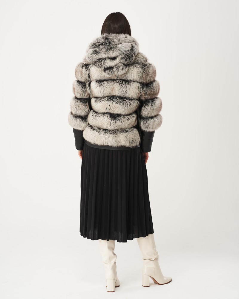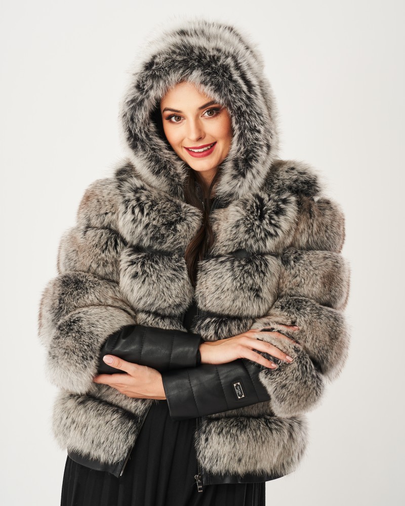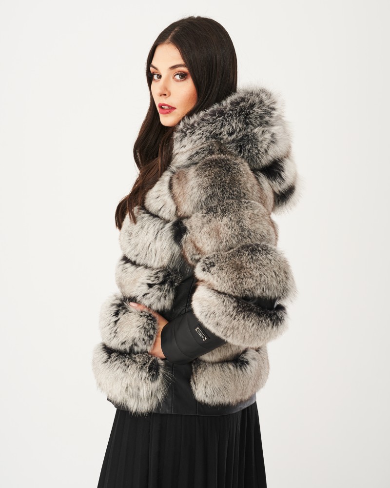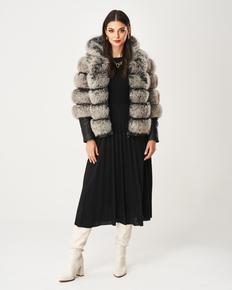Damen Lederjacken Omena wurde in Hüftlänge entworfen, und der lockere Schnitt garantiert außergewöhnliche Bewegungsfreiheit und Lässigkeit. Die großzügige Kapuze aus Fuchspelz schützt auch den Kopf vor Kälte und verleiht Ihnen einen charmanten und schmeichelhaften Look. Das Herzstück des Modells bilden die originell gestalteten, langen Ärmel, die aus zwei Teilen bestehen – der Fuchspelz reicht über die Ellbogen hinaus, während das Lammleder einen geraden, langen Manschettenabschluss mit auffälligen Steppnähten bildet, zusätzlich veredelt durch ein kleines Markenlogo. Das Modell ist mit einem robusten, rostfreien Reißverschluss versehen, der den thermischen Komfort erhöht.