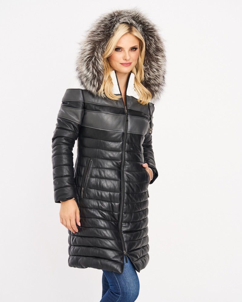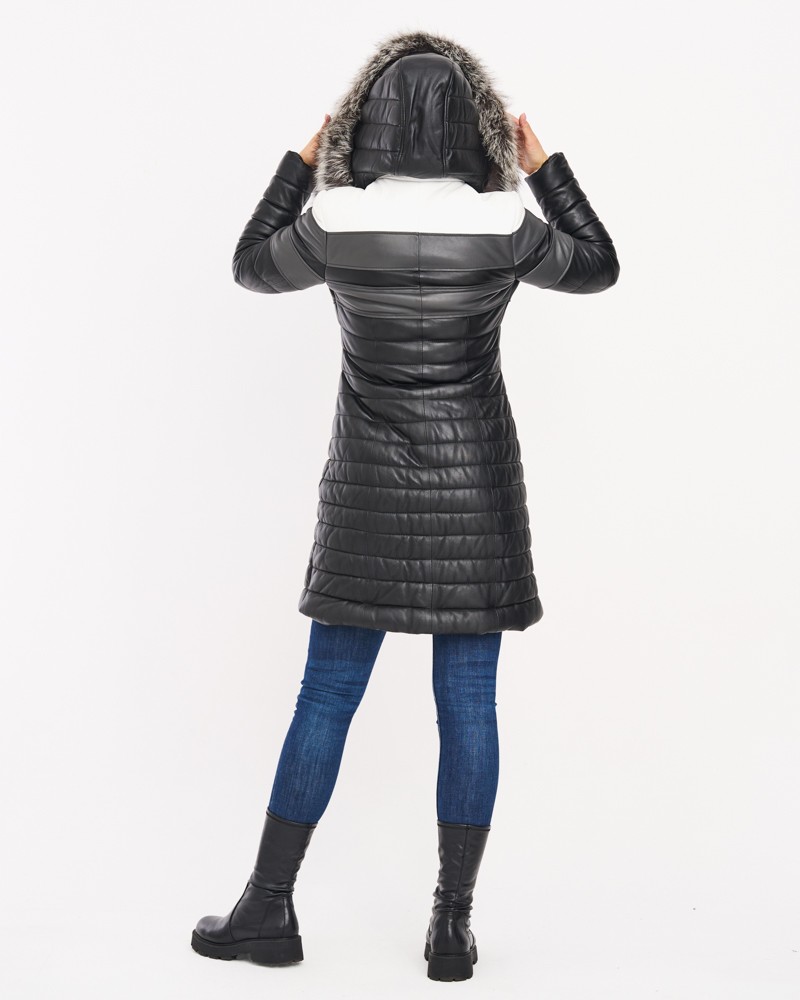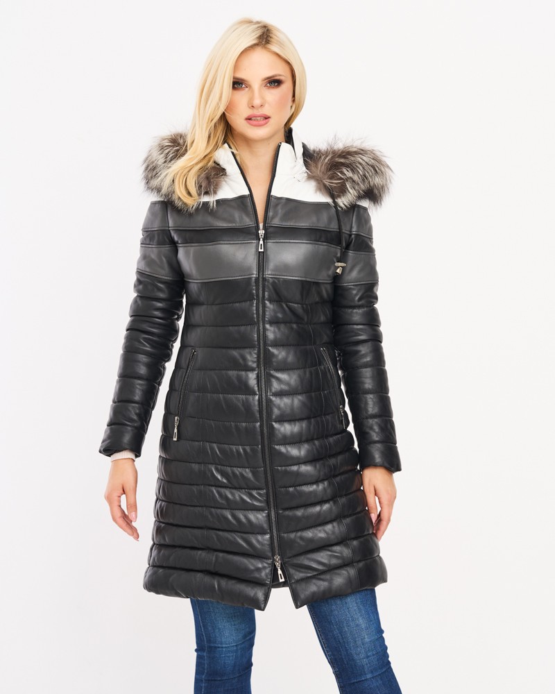 Stylische, äußerst feminine, gefütterte und gesteppt Damen Ledermantel Felicja, gefertigt aus natürlichem, nappaleder Lammleder in mehreren interessanten Farbtönen, mit abnehmbarer Kapuze besetzt mit echtem Fuchsfell. Sie bietet hohen Wärmekomfort sowie ein ausgezeichnetes Aussehen an kühlen Herbst- und Wintertagen.