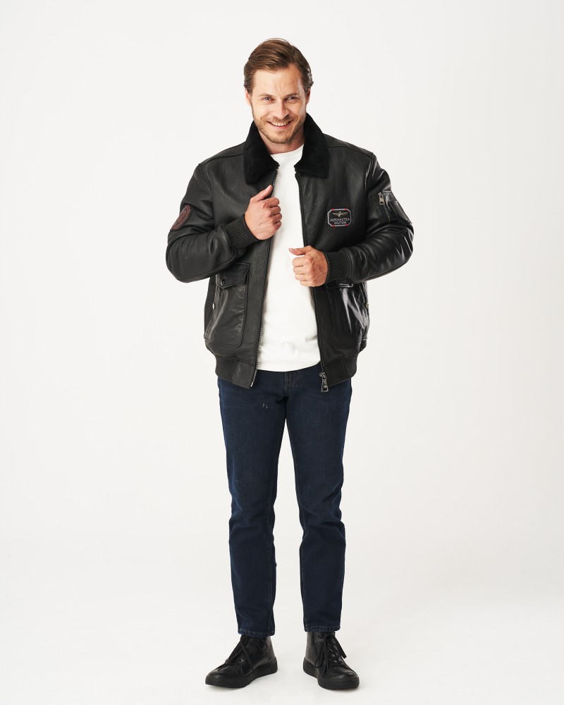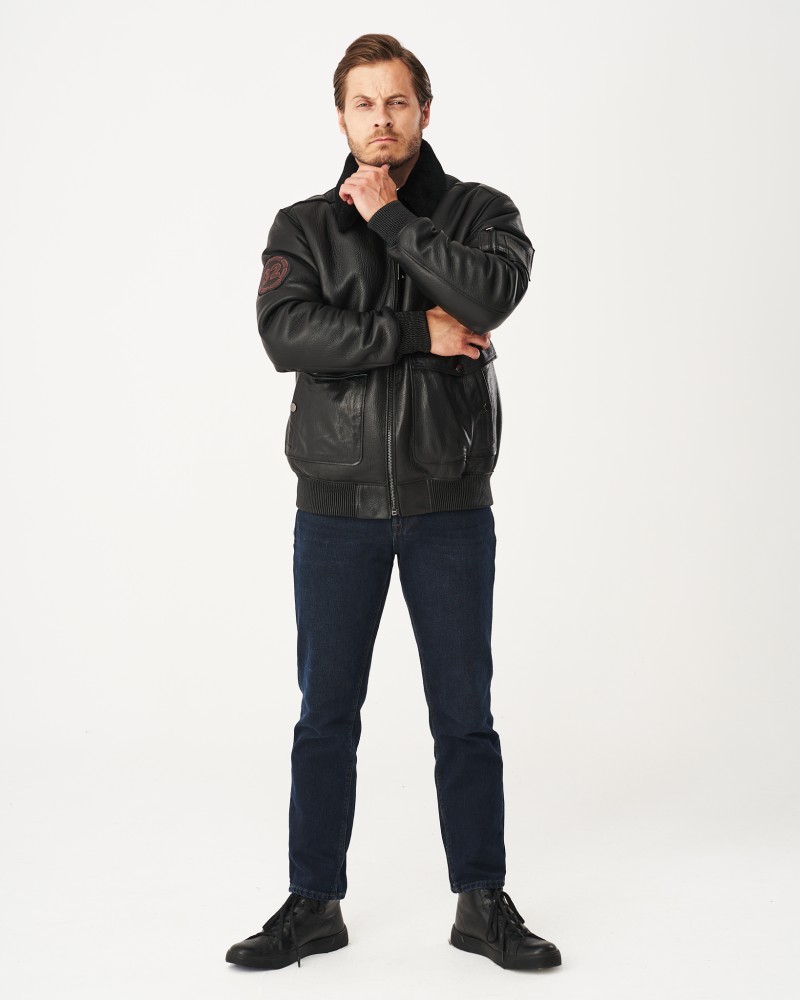 Die Herren Lammfelljacke Harrison wurde in Hüftlänge entworfen, und ihr Design wurde unten an den Seiten und vorne mit einem elastischen, breiten Bund ergänzt, der eine individuelle Anpassung an die Körperform ermöglicht. Auch die Ärmel sind mit einem Bund versehen, eine Lösung, die außergewöhnliche Optik mit Praktikabilität verbindet. Das Modell, komplett mit einem langlebigen, hochwertigen und zuverlässig funktionierenden Reißverschluss verschlossen, garantiert optimalen thermischen Komfort. Oben ziert ein kleiner schwarzer Fellkragen die Jacke. Die Lammfelljacke verfügt über zahlreiche Taschen – zwei doppelte vorne, die es ermöglichen, wichtige Kleinigkeiten zu verstauen und die Hände zu wärmen, sowie eine kleine Tasche am Ärmel, die mit einem Reißverschluss verschlossen wird und dem Modell einen originellen Charakter verleiht. Der Rücken der Jacke wird durch geometrische Nähte belebt. Dekorative Aufnäher am Ärmel und vorne auf Brusthöhe greifen den Stil amerikanischer Fliegerjacken auf.