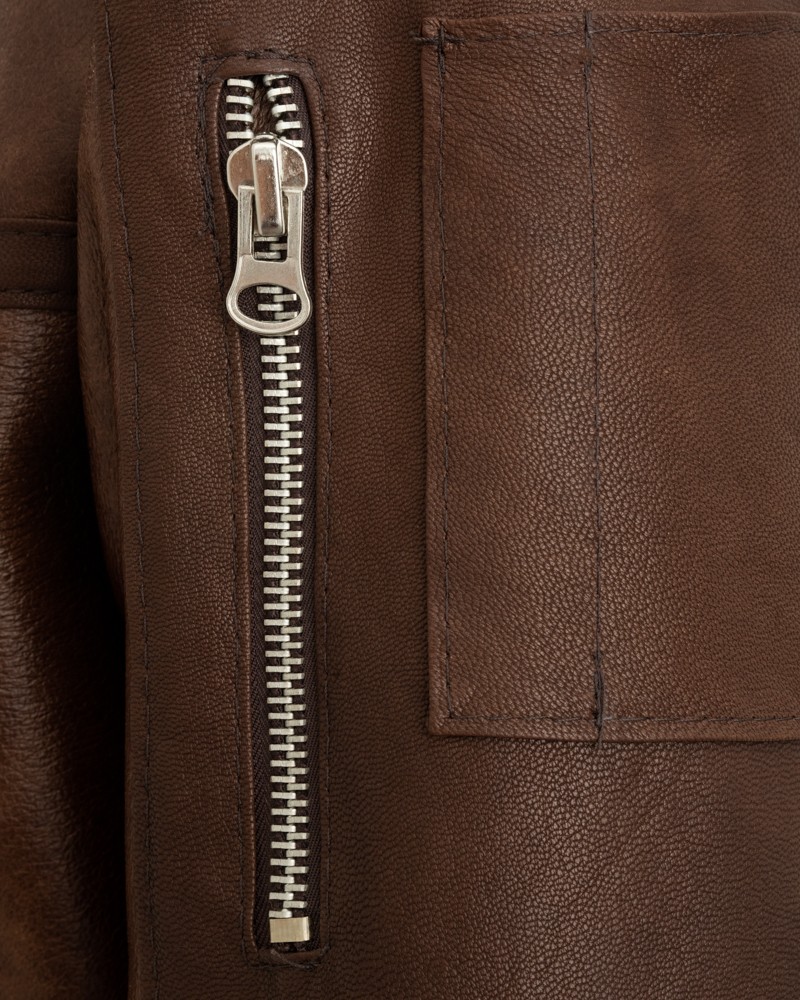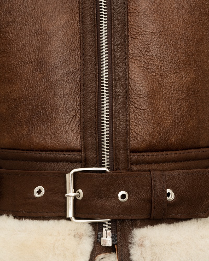Die Herren Lammfelljacke Stanley ist klassisch geschnitten. Der Schnitt schränkt die Bewegungsfreiheit nicht ein und bietet viel Komfort. Ein praktlicher Reißverschluss erleichtert die tägliche Nutzung der Jacke. Der aufschlagbare Kragen, der Saum und die Manschetten der langen Ärmel sind mit hellem, natürlichem Lammfell versehen, das einen schönen Kontrast zur tiefen, dunklen Farbe der Jacke bildet. Zwei kleine Riemen am Kragen, die mit Schnallen verschlossen werden, ermöglichen es, einen Stehkragen zu formen, was besonders nützlich ist, wenn die Temperaturen sinken. Am unteren Rand der Jacke sorgt ein verstellbarer Gürtel für eine individuelle Anpassung an die Körperform. Die Jacke verfügt über keine Kapuze.